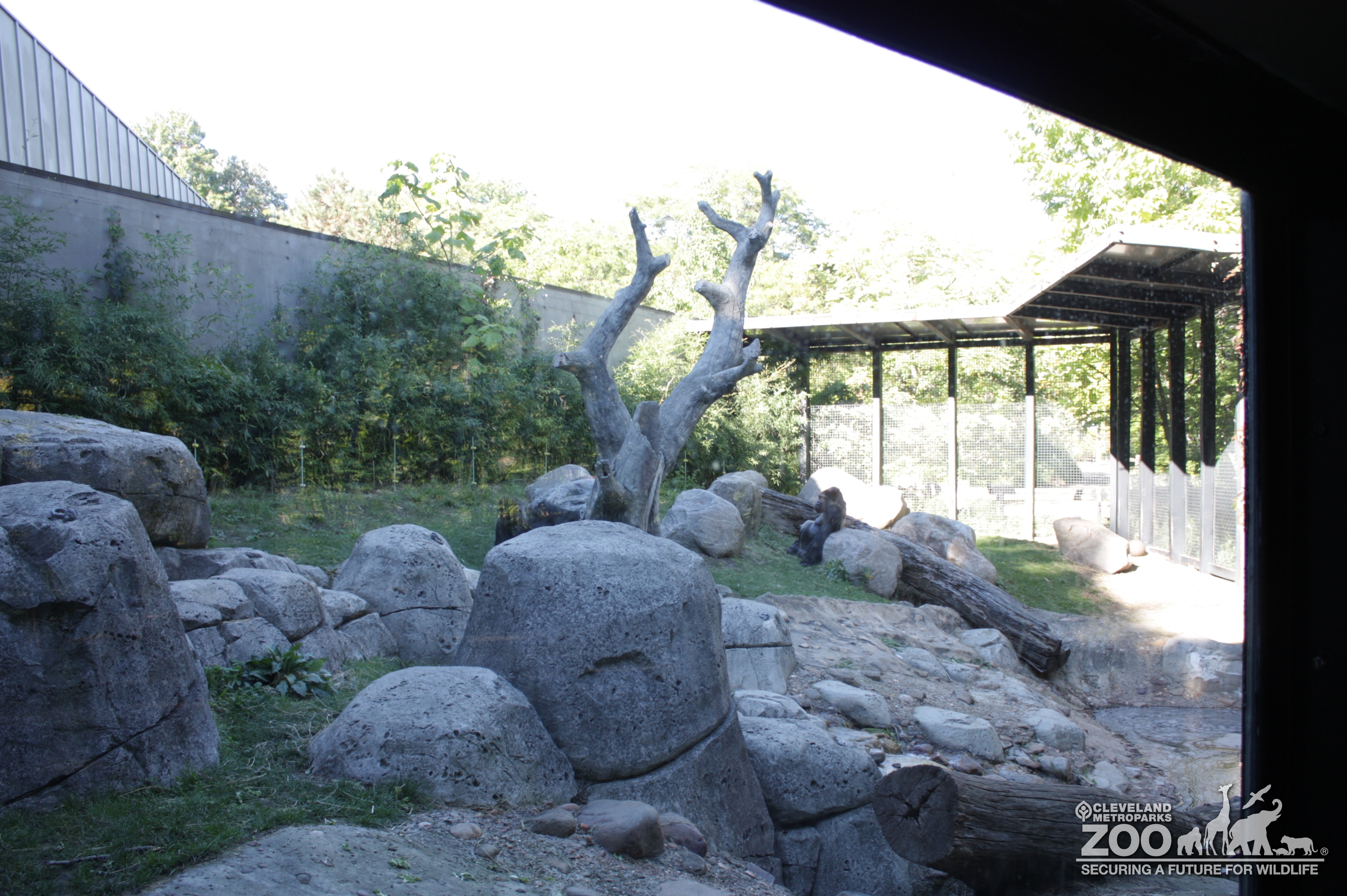 Outdoor gorilla habitat backside of Primate, Cat & Aquatics building. View from observation window looking across length of area. Large man-made boulders and climbing structures.