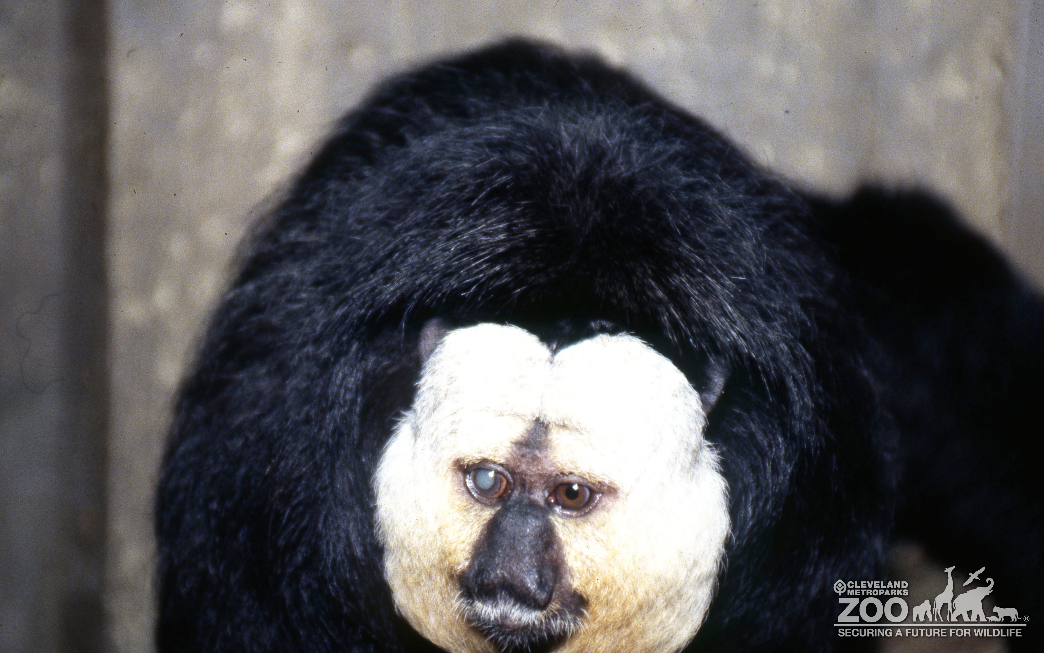 Also know as white-faced saki monkey, this a close-up of a male and his unique white face. Body fur is black.
