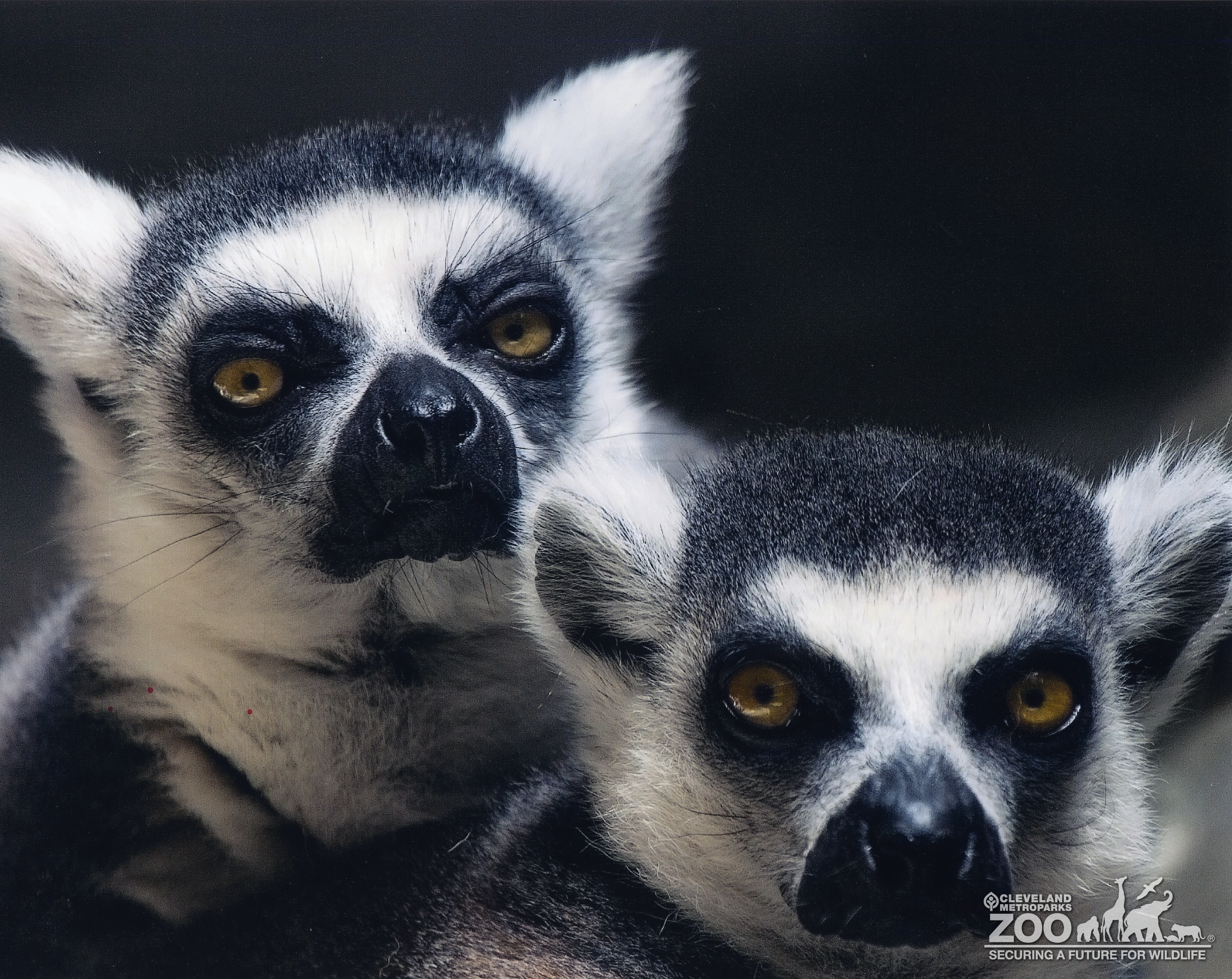 Pair of ring tailed lemurs close-up of their faces. They have golden eyes surround by black fur and white fur around that area and down to a black nose. White area on face creates a mask effect.