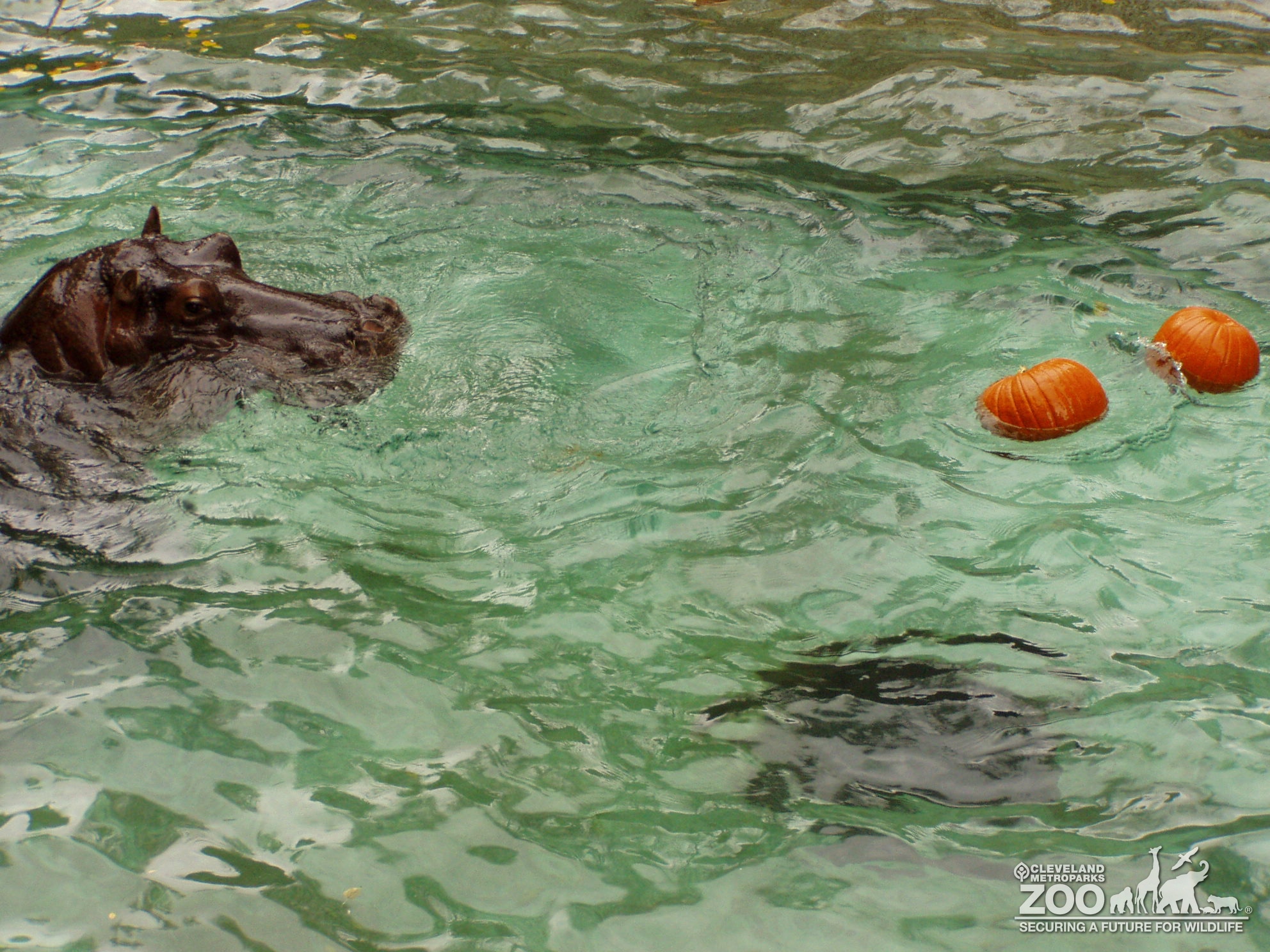 Nile hippo, Blackie, swimming with two pumpkins in his pool. All you see is his head moving toward two large pumpkins floating on the surface of the water.