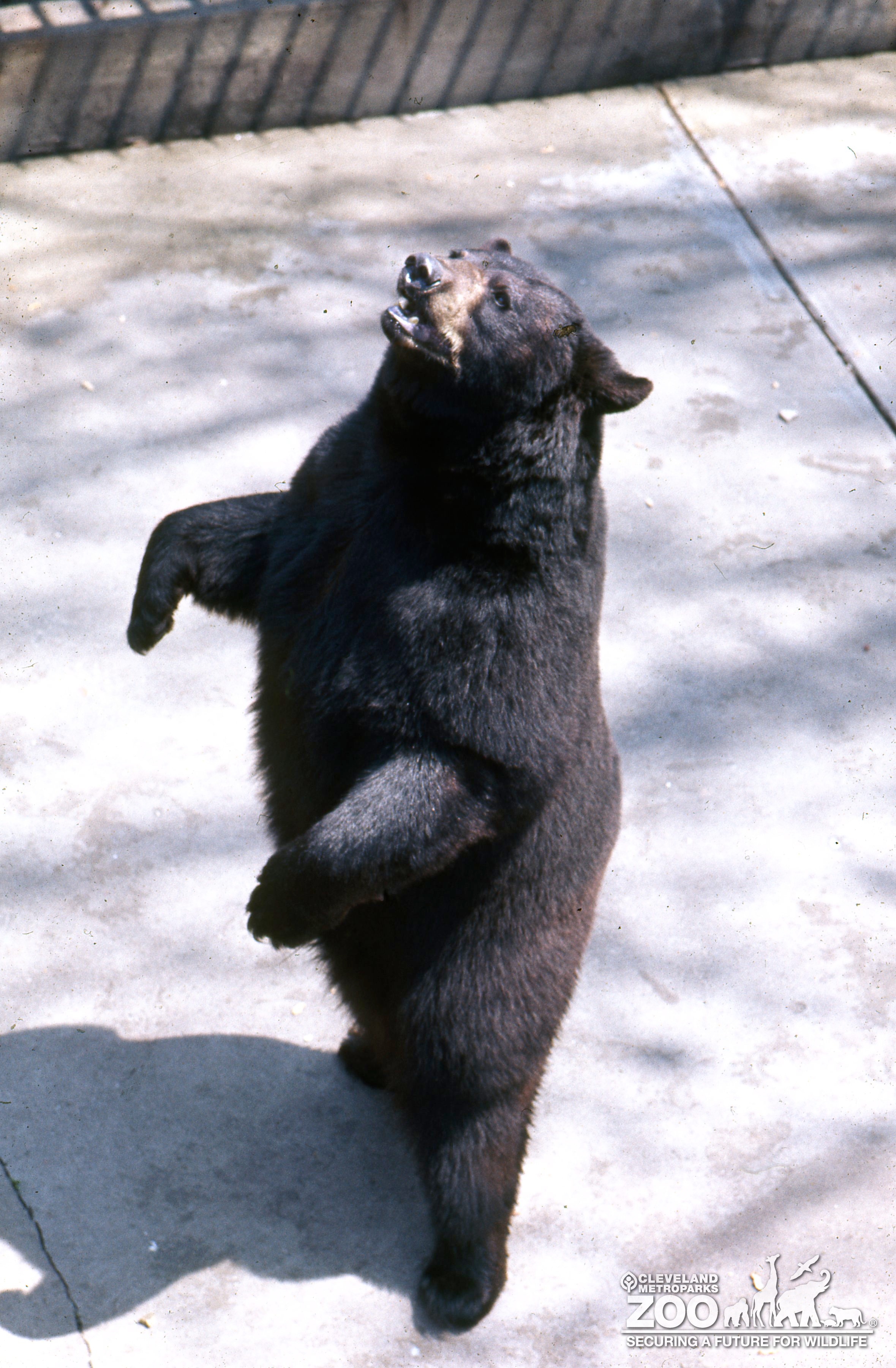 The North American Black Bear in this photo is looking up at the camera, standing on it's hind legs while holding up it's front paws. The bear is covered in short black fur all over it's body with some brown fur around it's muzzle. In the background is the grey concrete ground of the bear's enclosure.