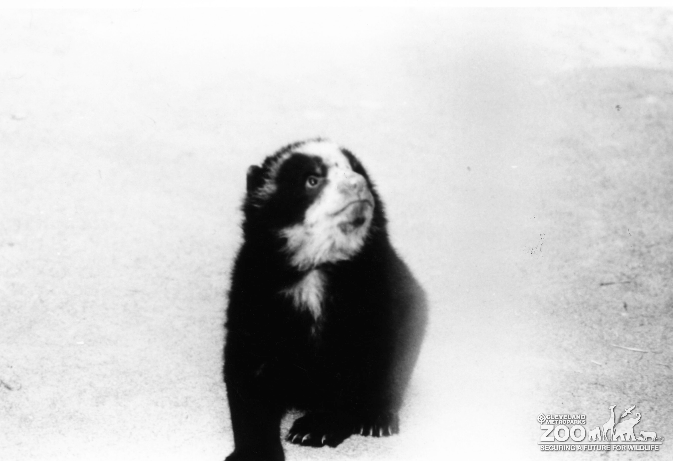 This is a black and white photo of an Andean (Spectacled) Bear cub. The bear cub has it's head turned up and to the left as it walks toward the camera. It is covered in black fur with brown fur around it's muzzle as well as flecks around it's eyes giving the appearance that it is wearing spectacles.