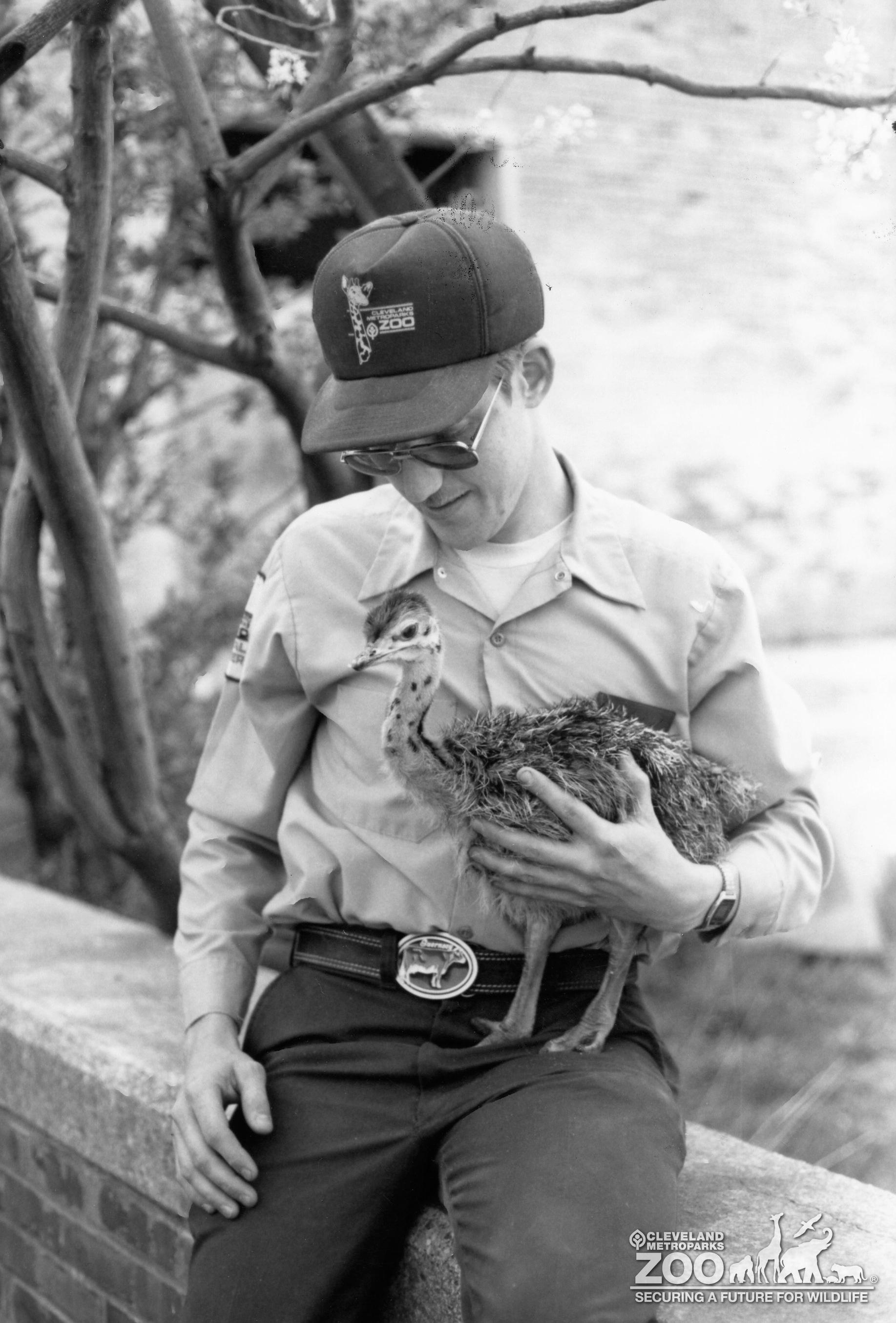 Black & white image of male keeper holding a bay ostrich. The bird is the size of a large chicken. They are outside the old Pachyderm building. Keeper is sitting and holding the ostrich with one hand. Keeper is wearing a ball cap with old zoo logo on it.