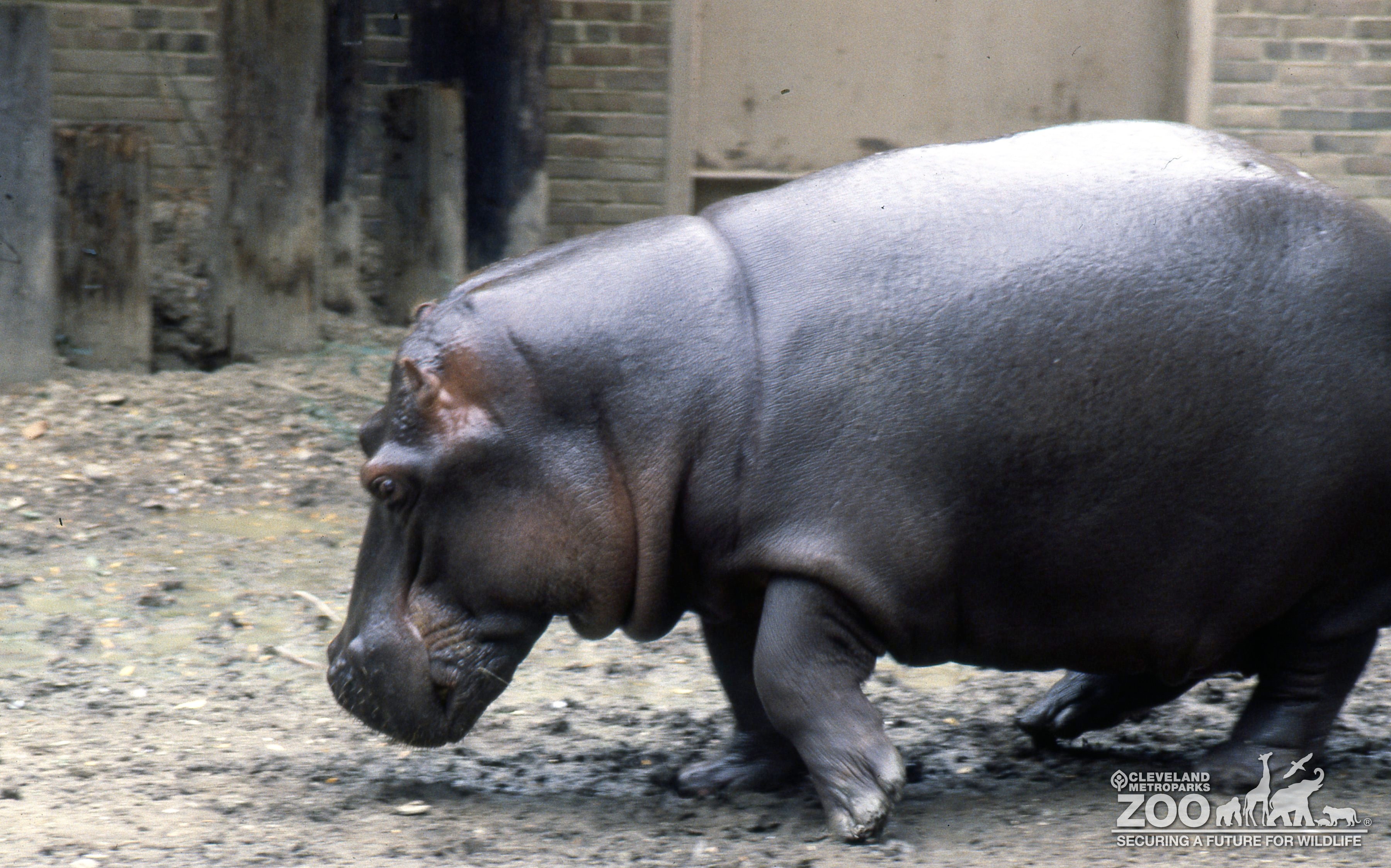 Nile hippo side view of animal walking outside behind old pachyderm building.