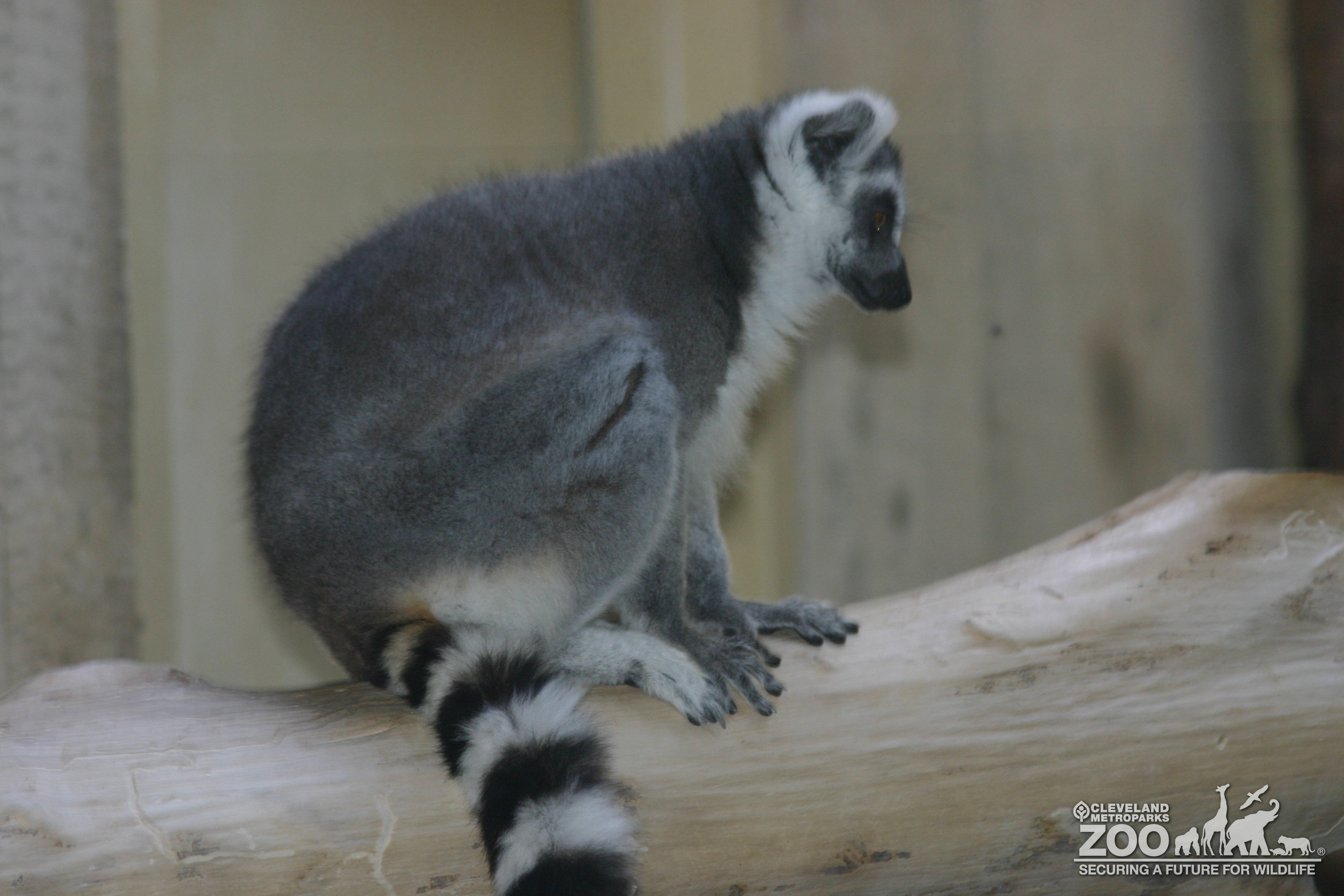 Ring-tailed lemur is sitting on a log. The black and white tail with namesake rings is in view.