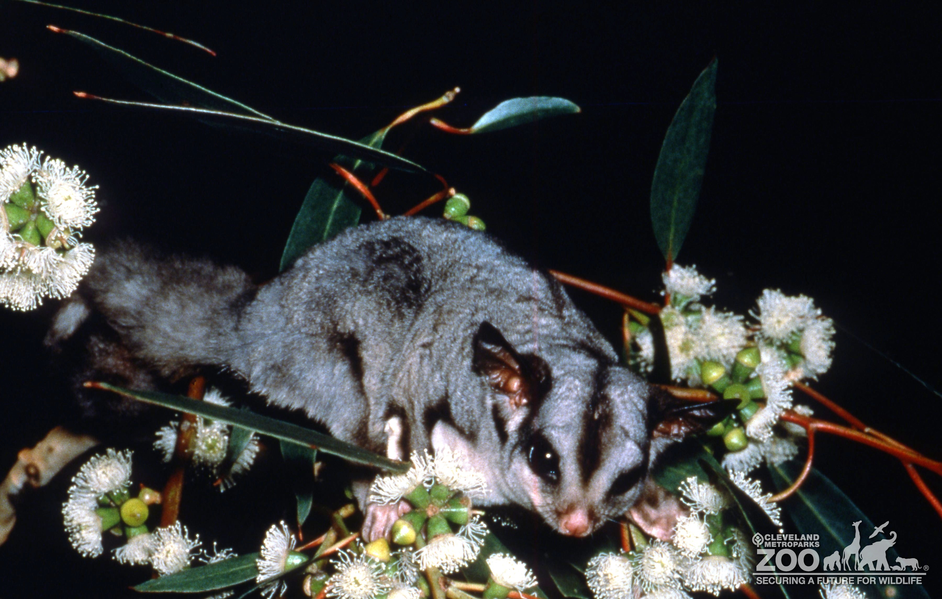 Sugar glider on a tree branch. Glider is nestled among the small white blossoms on branch. Its fur is light gray Glider has dark eyes and a stripe down its forehead, ending at its pink nose.
