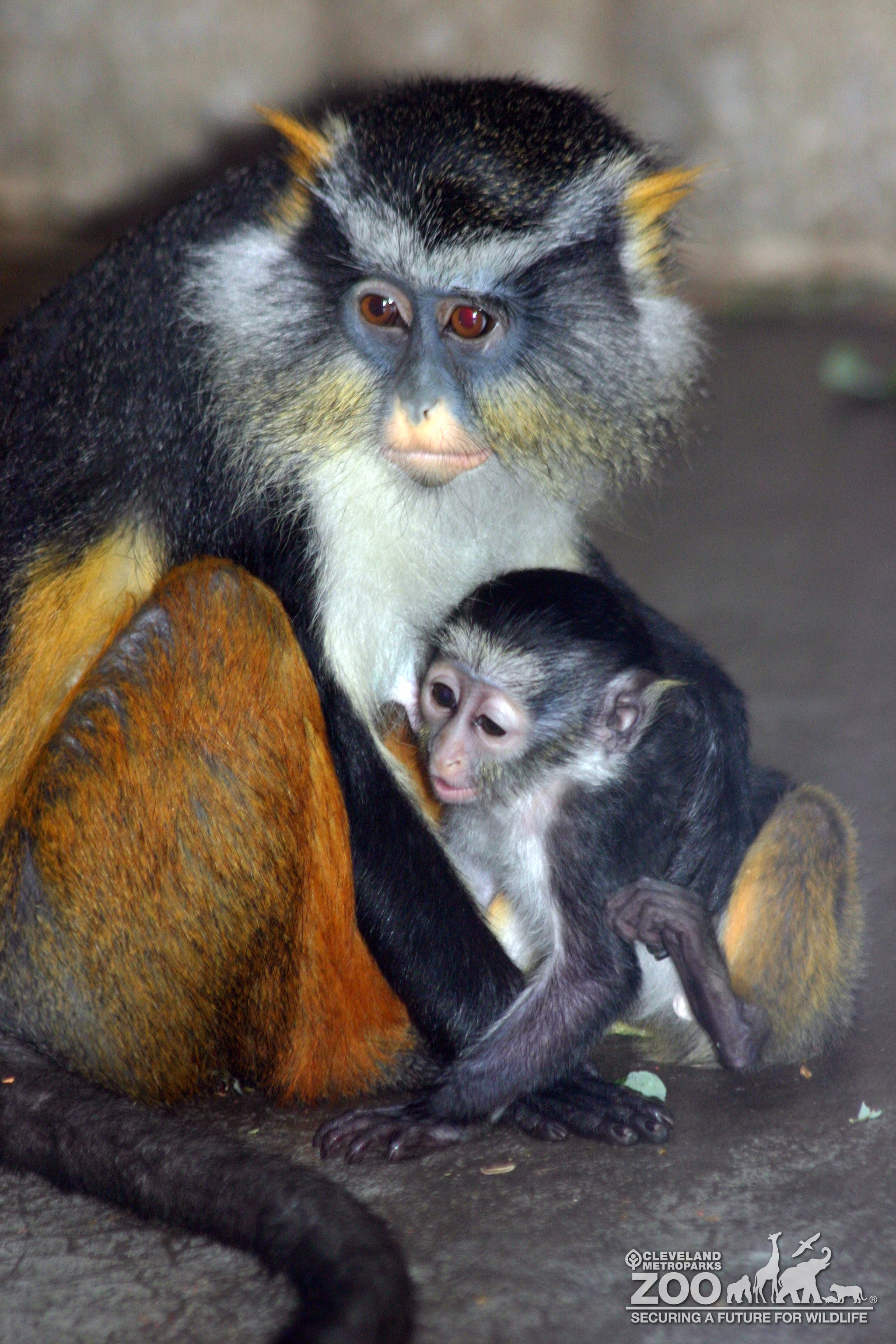 Wolf's guenon adult and infant. Infant is cradled in adult's arms. Both are looking to the left. Infant lacks the red fur highlight on its ears that the adult has.