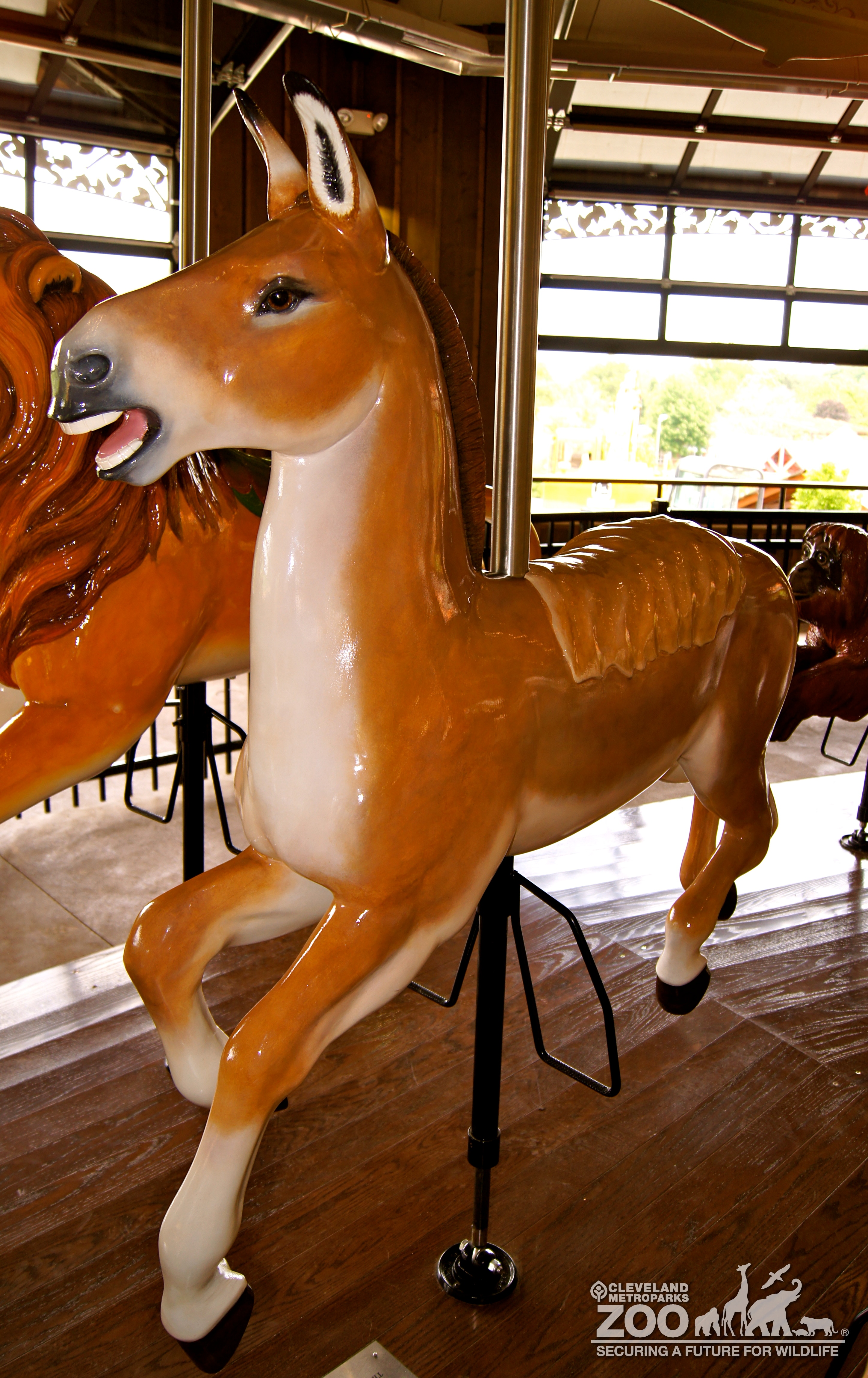Persian onager wood carving for carousel ride. No riders in image. Horse-like sculpture is painted tan.