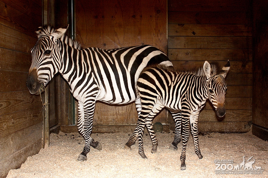 Adult zebra facing left and newborn zebra facing right in a wooden stall with newborn zebra's rear end in front of adult zebra's rear end.