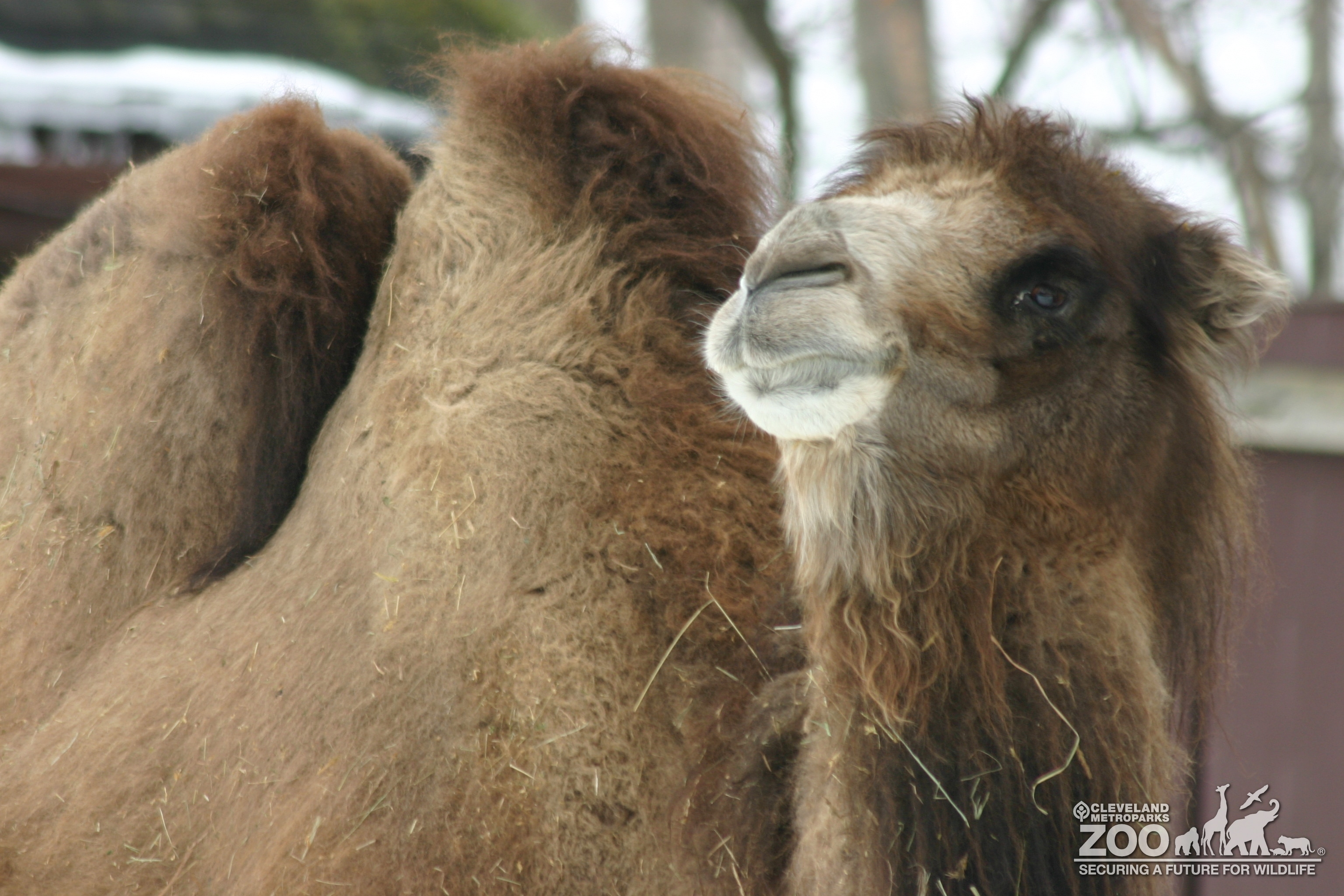 A view of a right side of a Camel standing in its outdoor enclosure looking away from the camera showing off the left side of its face. From its head to the large hump in middle of its back, the camel is covered in long light brown fur. On its face, the camel has shorter brown and white fur.