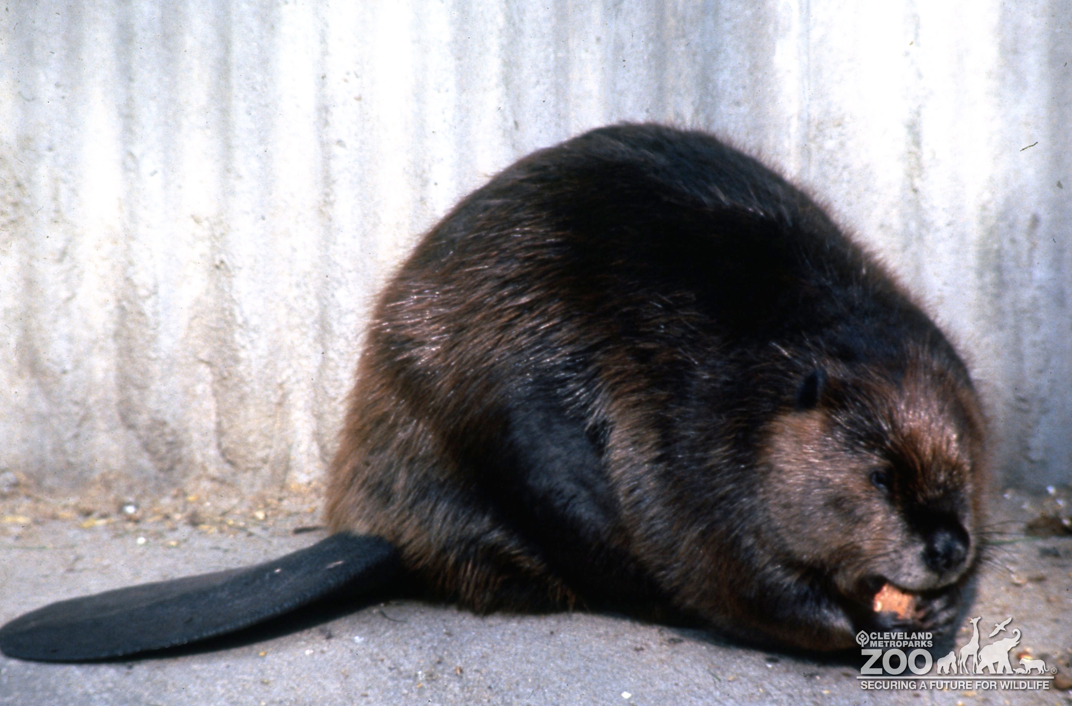 This beaver is sitting out in its enclosure holding on to an orange carrot it is munching on. The beaver looks similar to a rodent and is covered in reddish brown fur with flat black tail. It has small beady eyes and a large black nose.