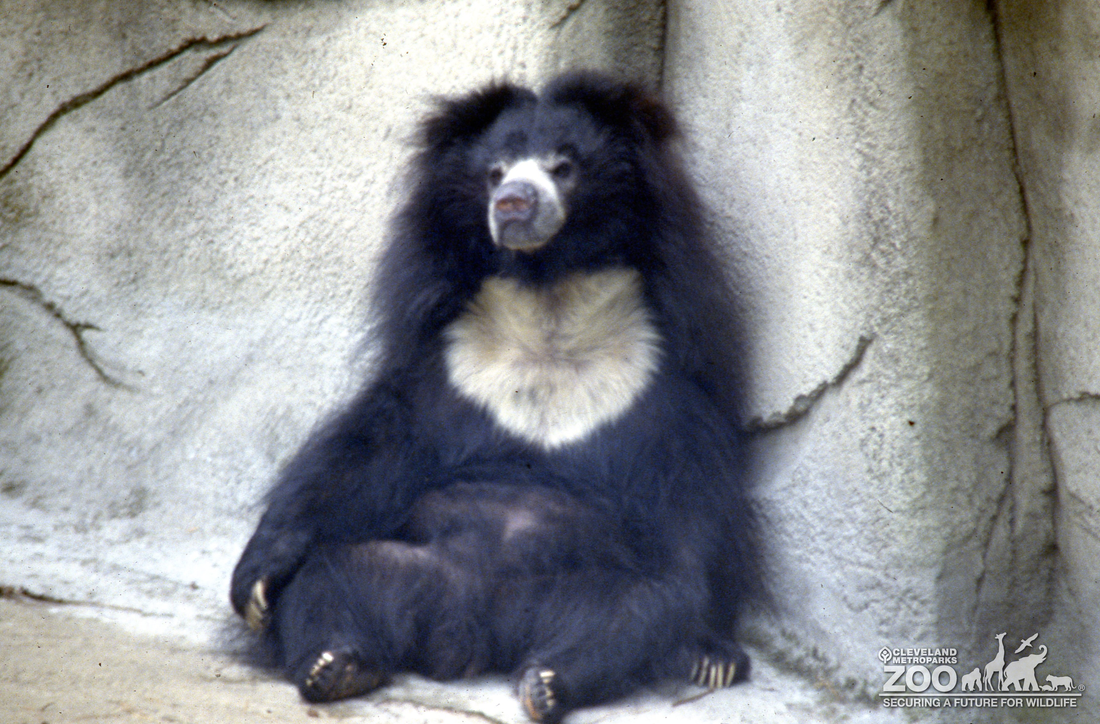 The Sloth Bear is sitting in its outdoor enclosure looking towards the camera. It is sitting with its back up against a grey rock wall. The bear is covered long black fur with light grey fur on its muzzle and a large patch on its chest.