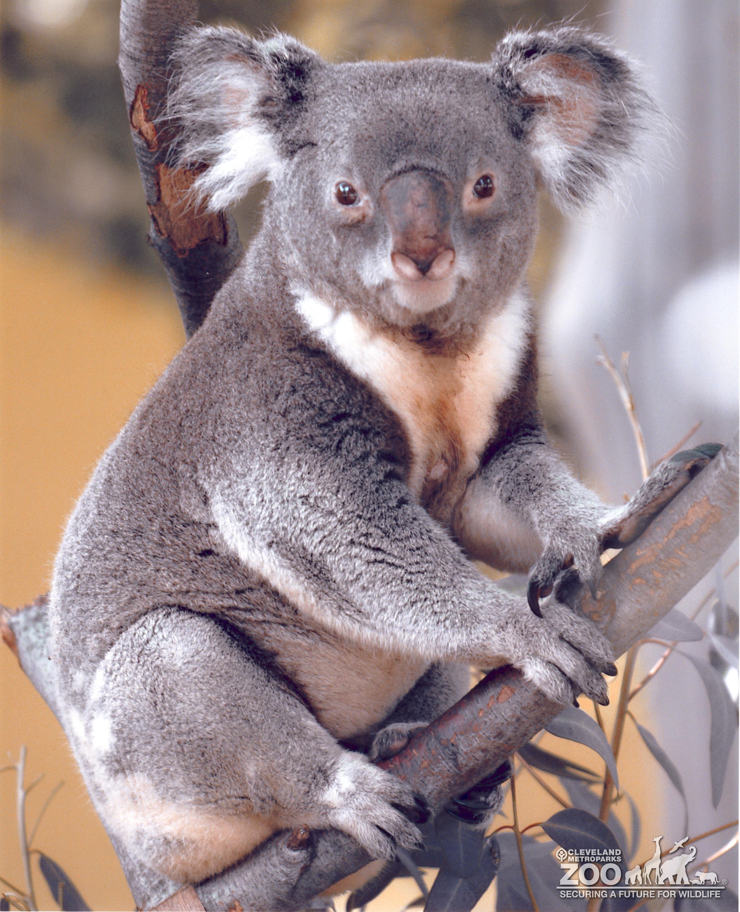 Koala sitting facing the camera while perched in a tree. Animal has long sharp claws to hold on to branch. This animal is in gumleaf hideout which is part of Australian Adventure.