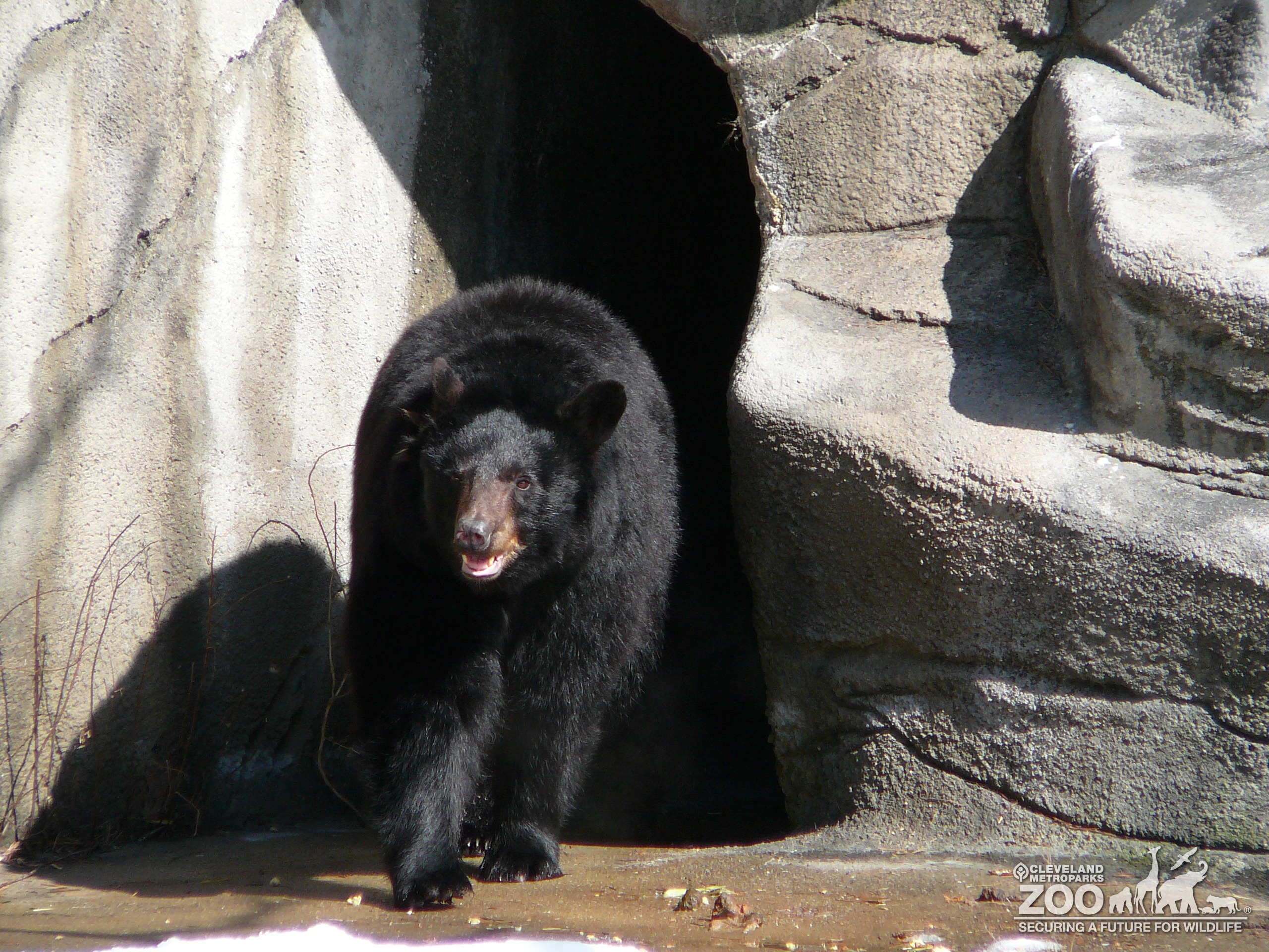 This North American Black Bear is walking out of a shady cave in it's outdoor enclosure. The bear is covered in short black fur all over it's body with some brown fur around it's muzzle. In the background is the grey rocky walls of the bear's enclosure.
