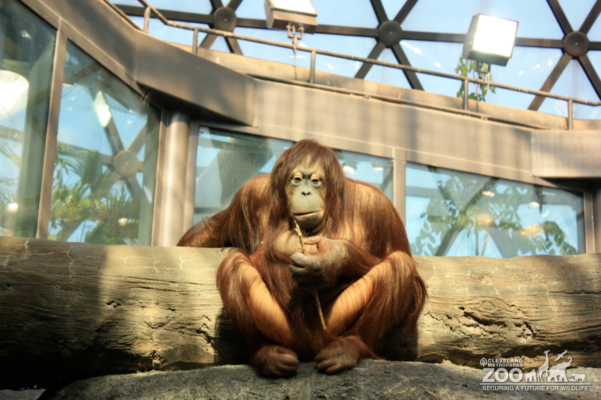 Orangutan facing forward. It is sitting under the dome in The RainForest.