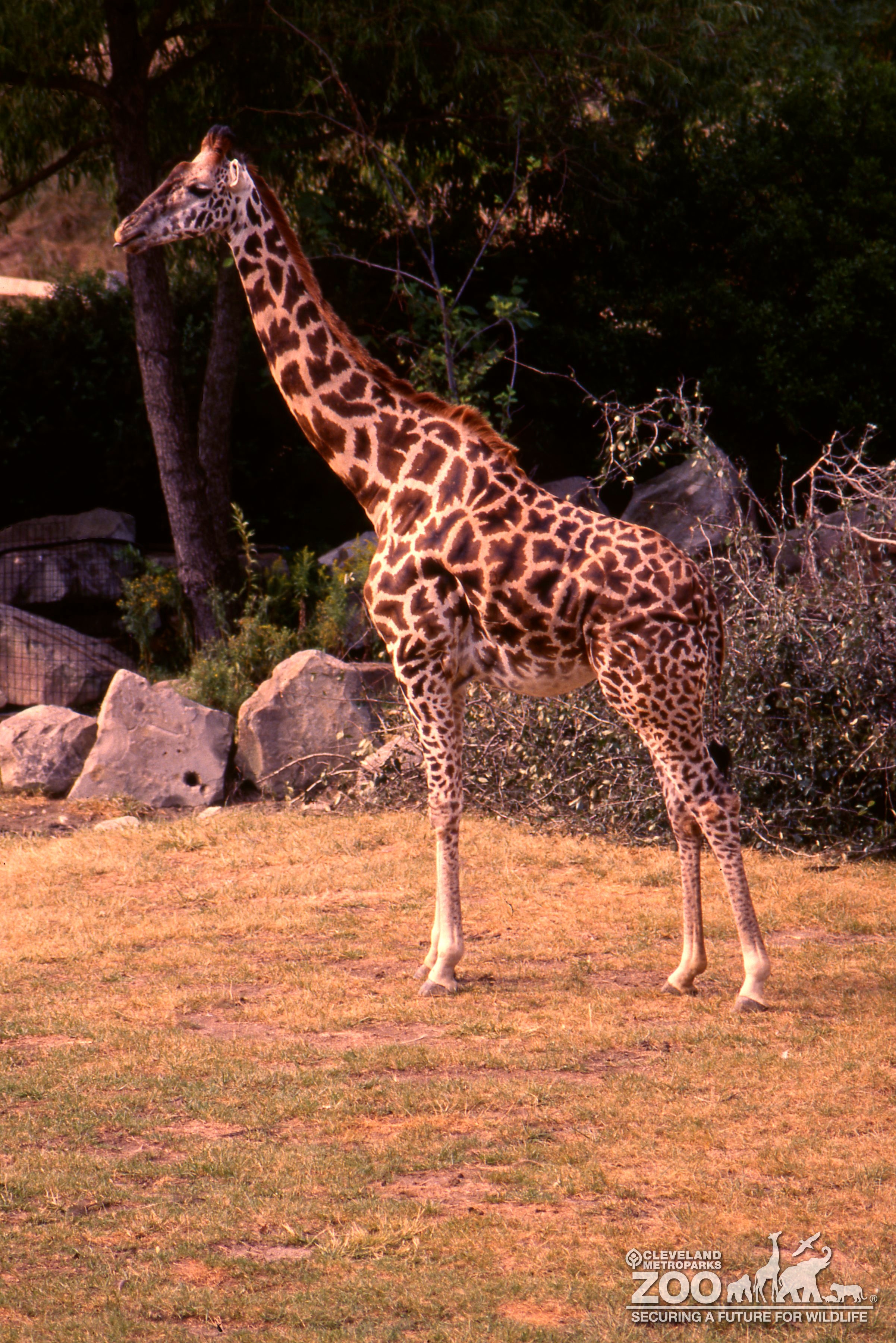 Masai giraffe stand with side to camera. It's outside and grass is brown from summer heat. Unique skin pattern is well displayed.