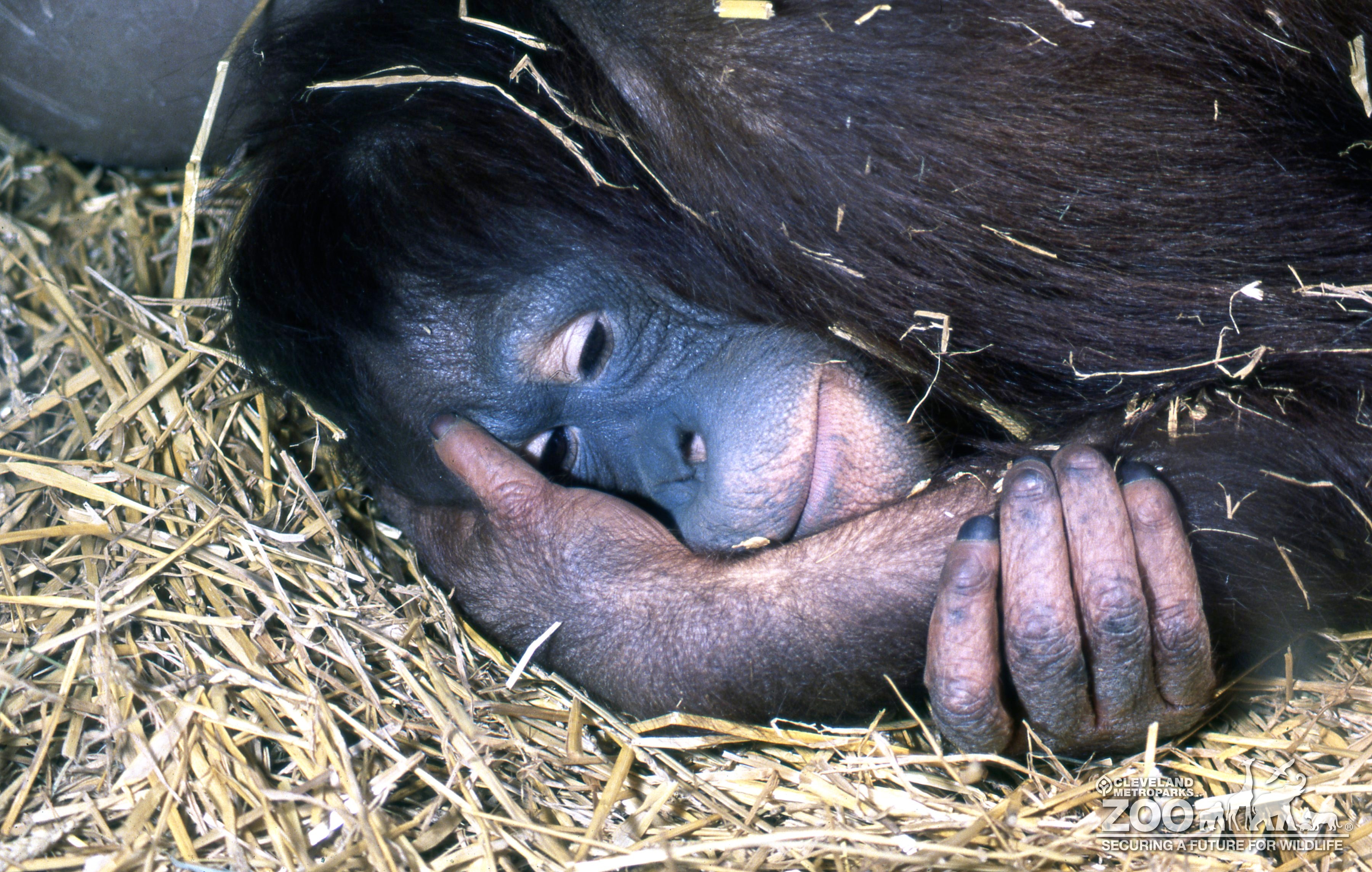 Orangutan laying it head down on a bed of hay resting. It has one hand cradling its face. View is only of head and shoulders.