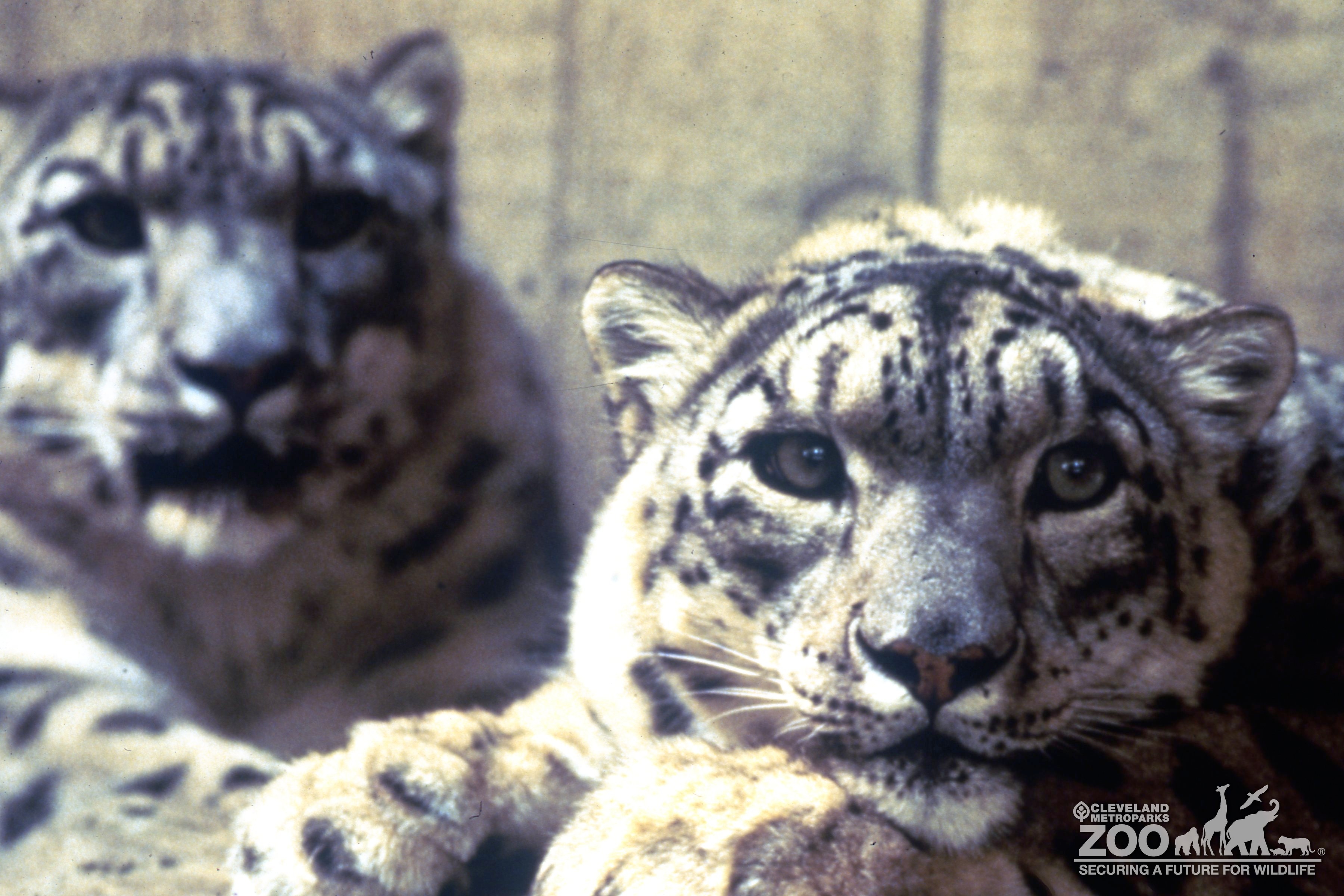 Pair of snow leopards faces fill the image. One is in the foreground looking straight at camera. The other cat is laying behind it, image is slightly out of focus