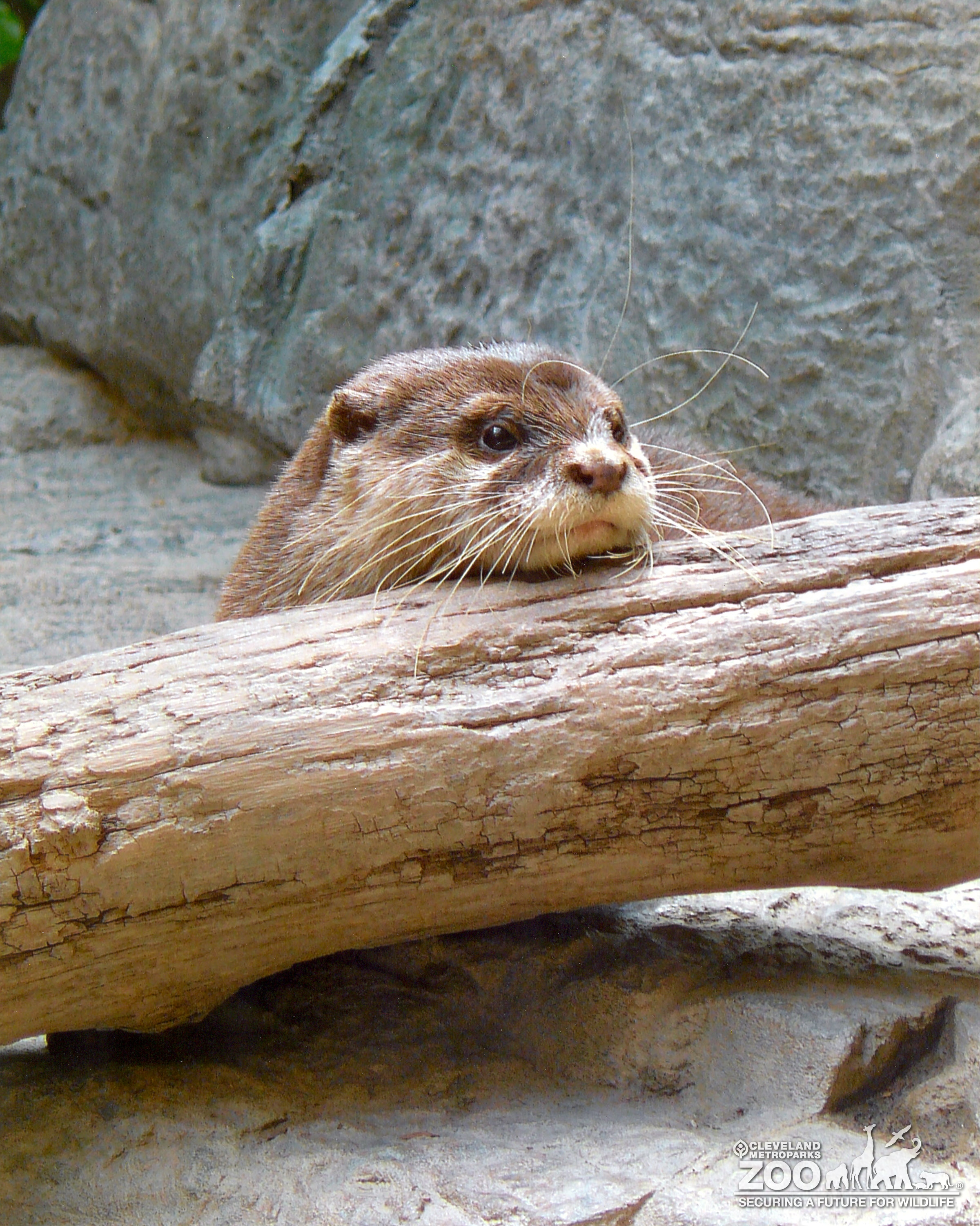 Asian small-clawed otter looking over a log in The RainForest exhibit second floor. View is only of its head and whiskers. It has brown eyes and sleek brown fur.