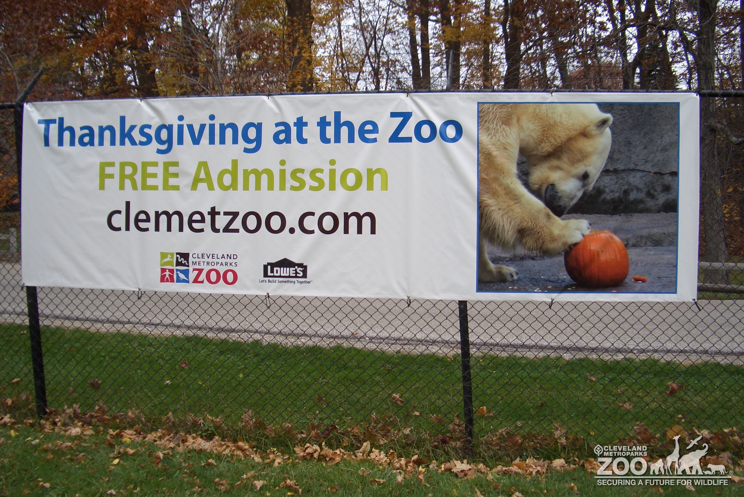 Banner with Polar bear pawing a pumpkin. On perimeter fence of the Zoo.