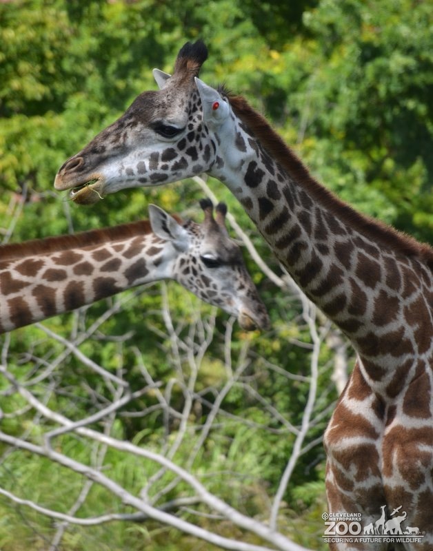 Two Masai Giraffes leaning towards each other. Only their heads and long necks are in the frame. One giraffe has a red ear tag used for identification purposes. In the background are blurred leafy trees.