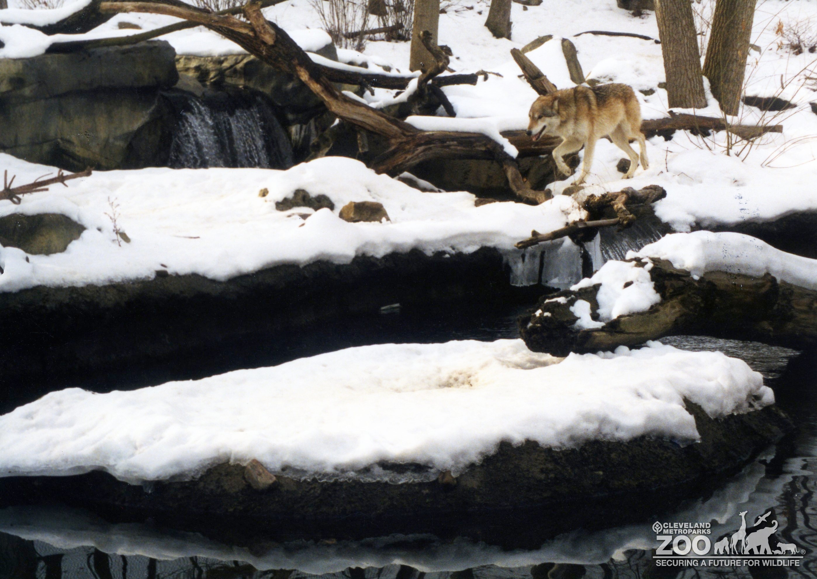 Photo shows a Mexican Gray Wolf at a distance crossing over a waterfall.