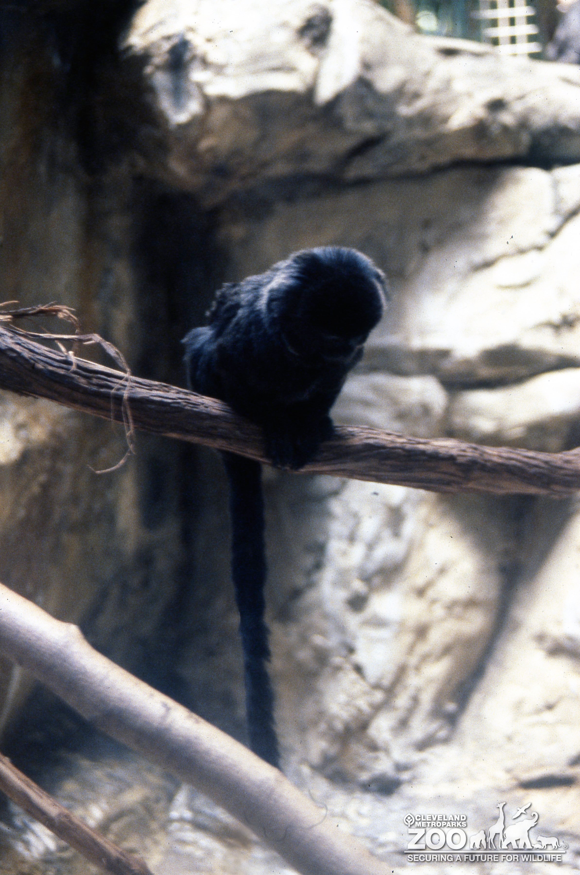 Goeldi's monkey is sitting on a branch leaning forward. Small primate is black and furry. It long fur covered tail is hanging down.