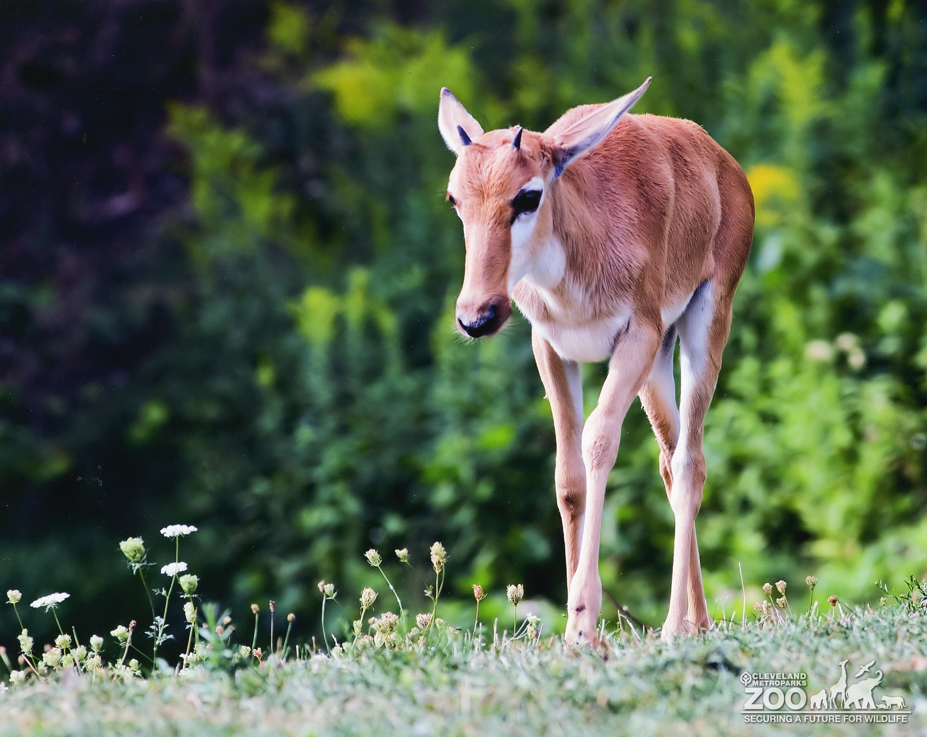 Bontebok calf with shades of light brown and small horns protruding from top of head. Bontebok calf facing forward and to the left with front left leg slightly lifted in motion.