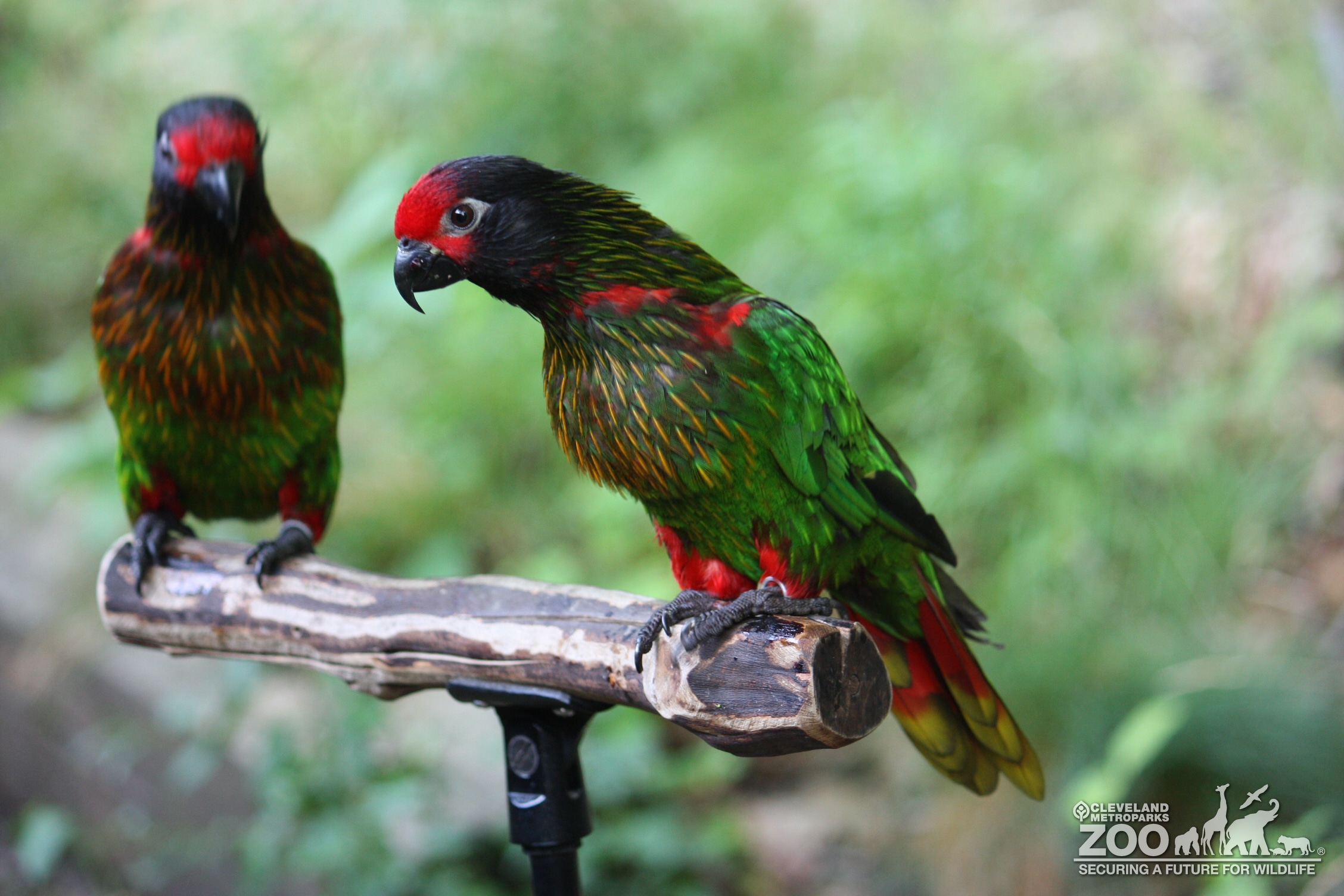 Yellow-streak lories on perch. These colorful lorikeets have yellow-streaked feathers around their neck and back. Bird are the size of a large robin.