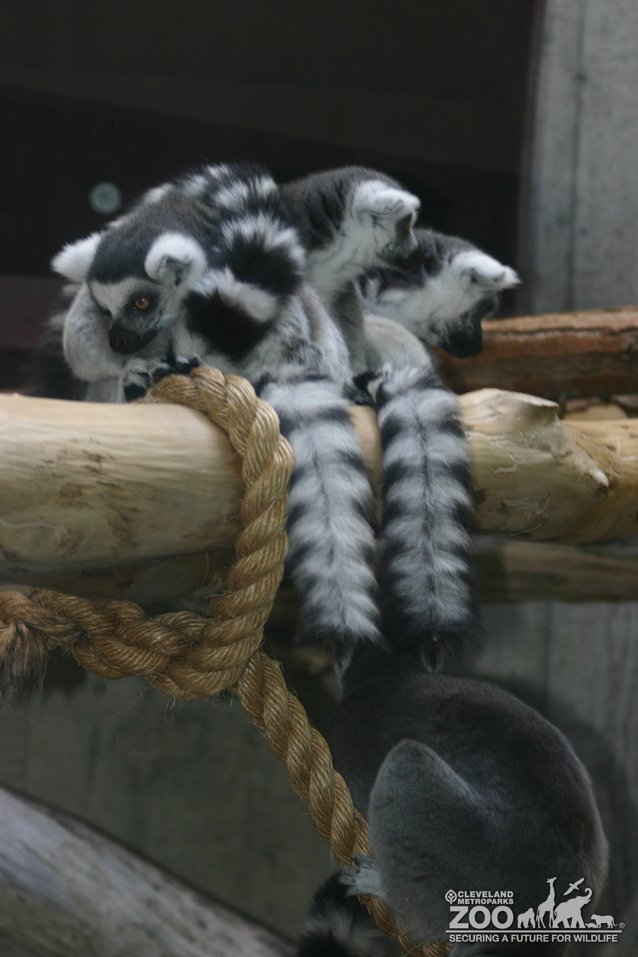Three ring tailed lemurs sitting on a log looking down at a fourth lemur. Large climbing rope is also in view. Primates live in the Primate, Cat & Aquatics building.