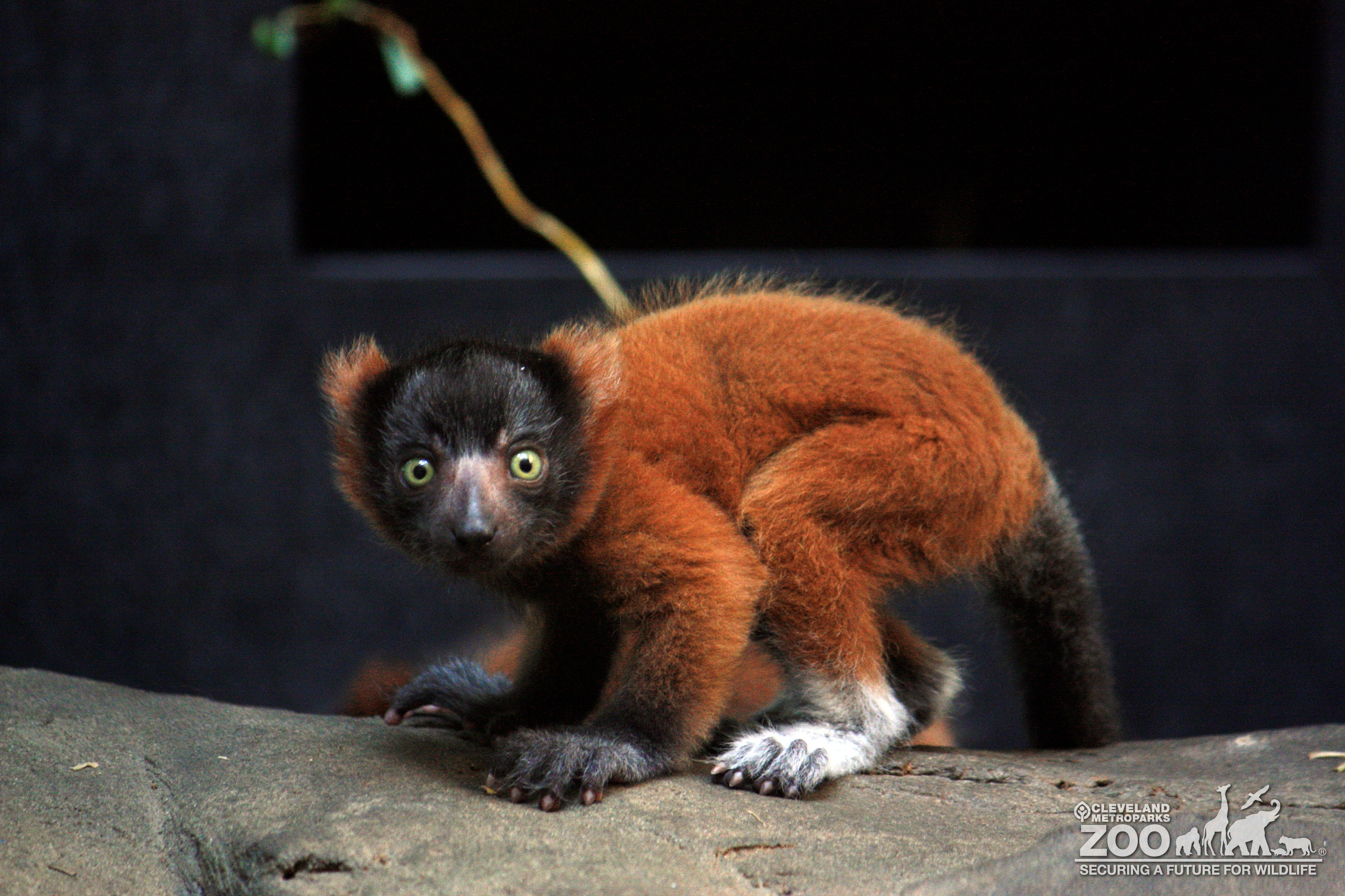 Very young red-ruffed lemur standing on all four limbs. Head twisted to face camera. Reddish brown fur covers its back. Good view on the primate fingers and long fur covered tail.