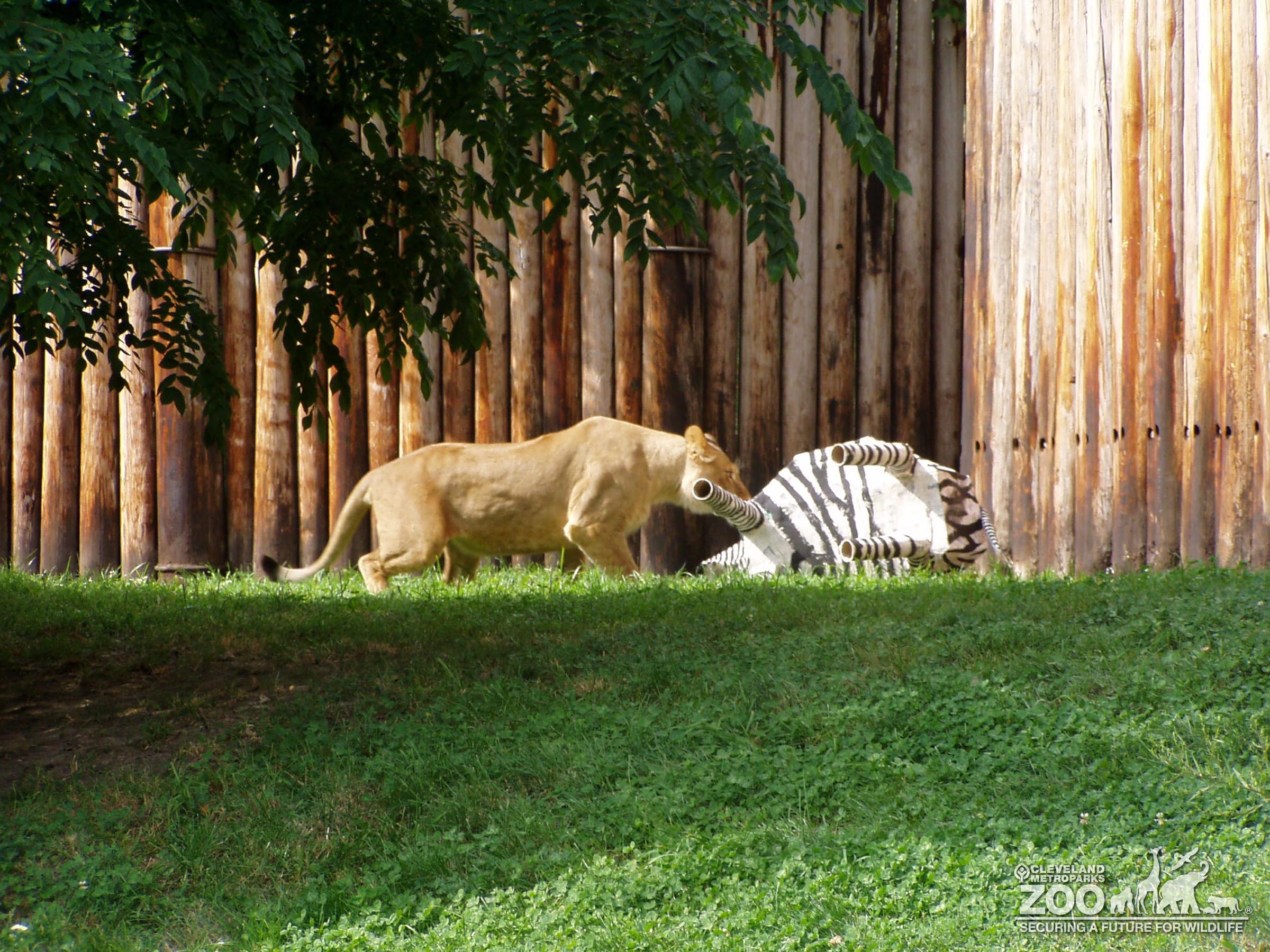 Lioness crouching and sniffing black and white paper mache zebra enrichment item on its side in front of log fence of habitat.