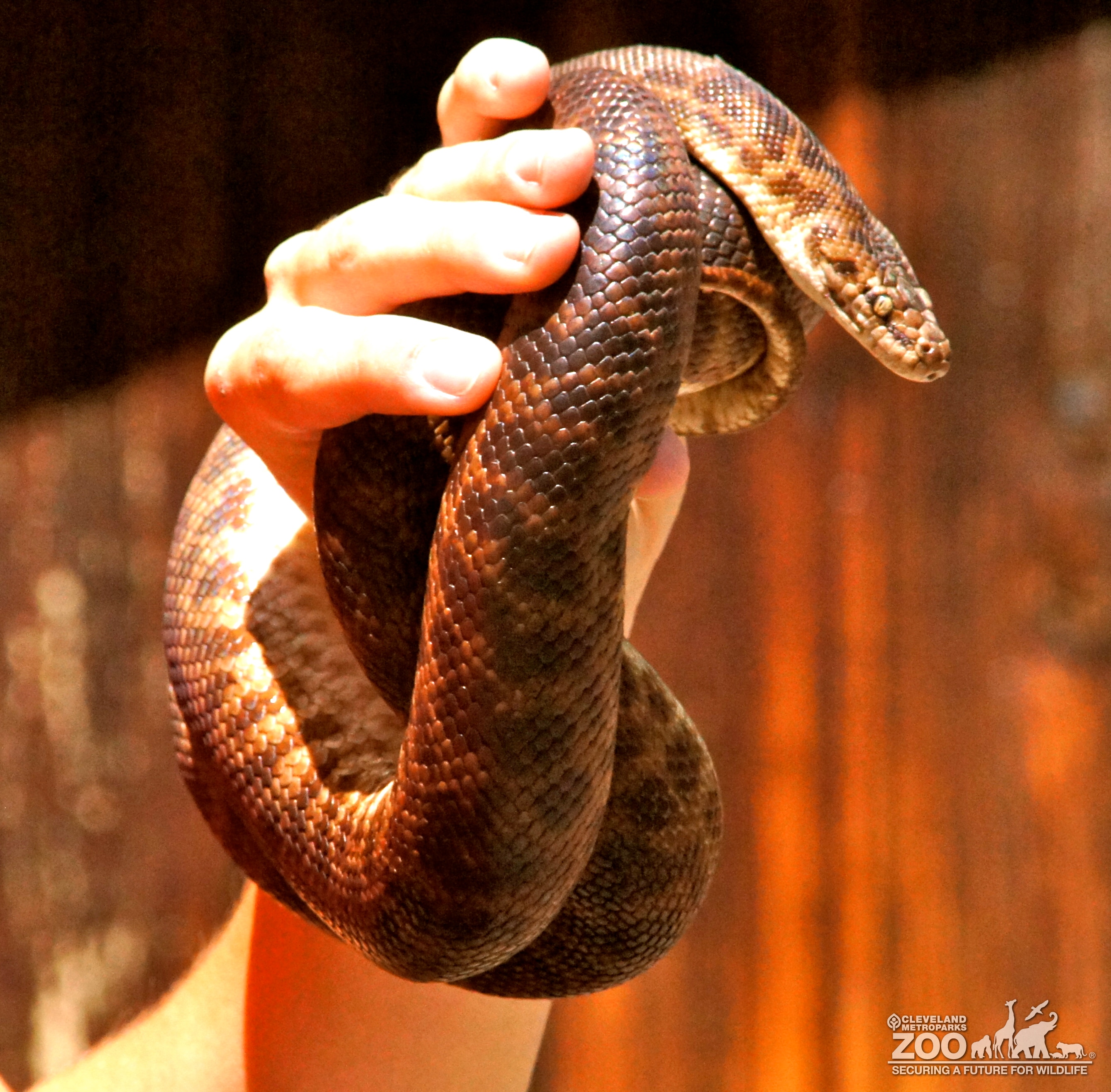 Python in shades of brown facing right and coiled around a handler's hand.