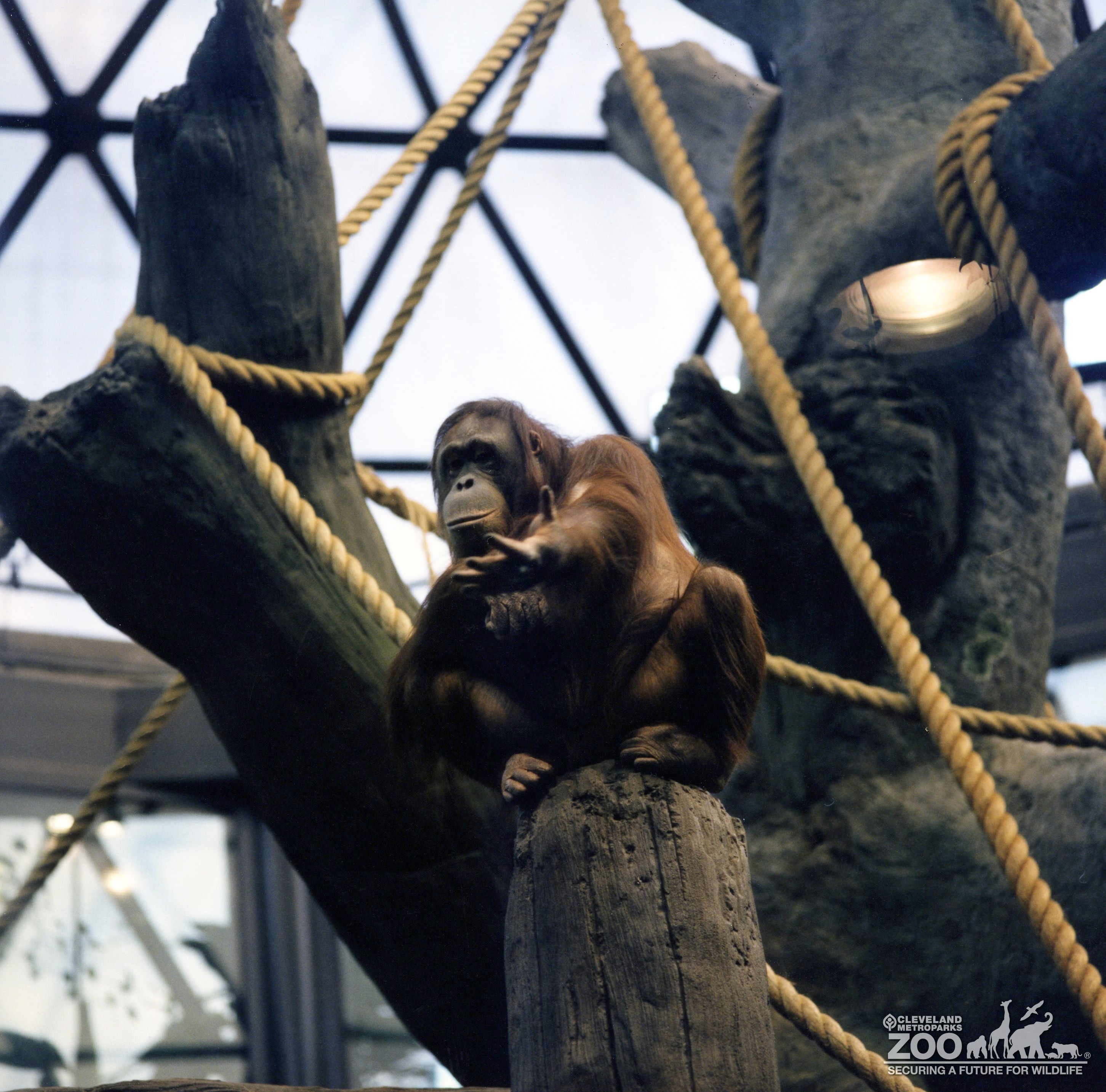 Orangutan sitting on a post high up in the tree under the RainForest dome. Window structure is in view. Large climbing ropes are hanging are the primate.