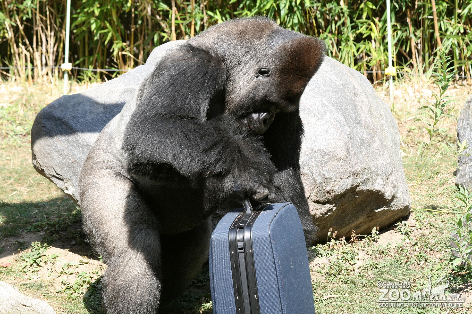Male gorilla with blue suitcase in outside gorilla habitat. Bamboo growing in background and large rocks in front.