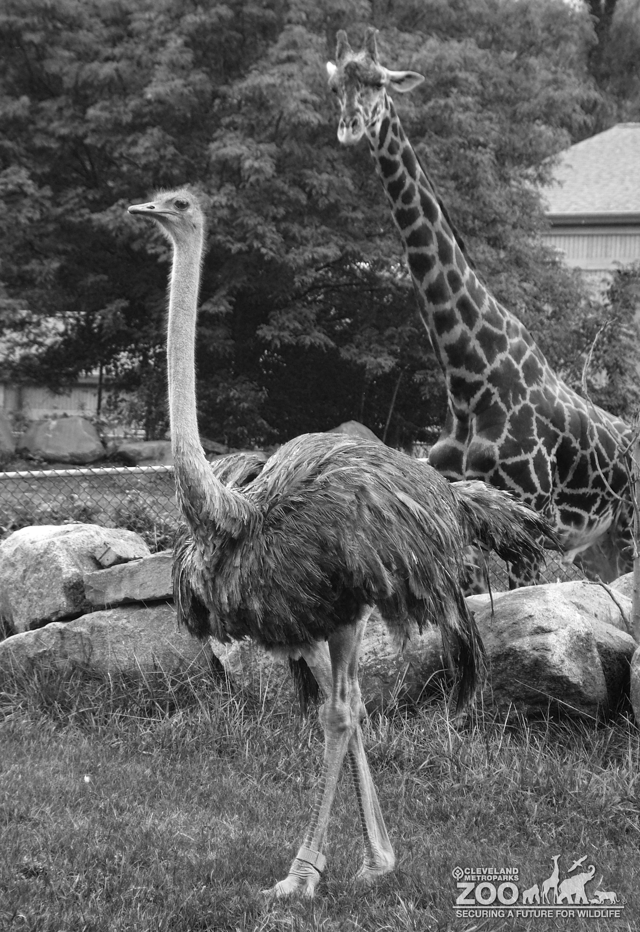 Ostrich - Black and White - Giraffe in Background