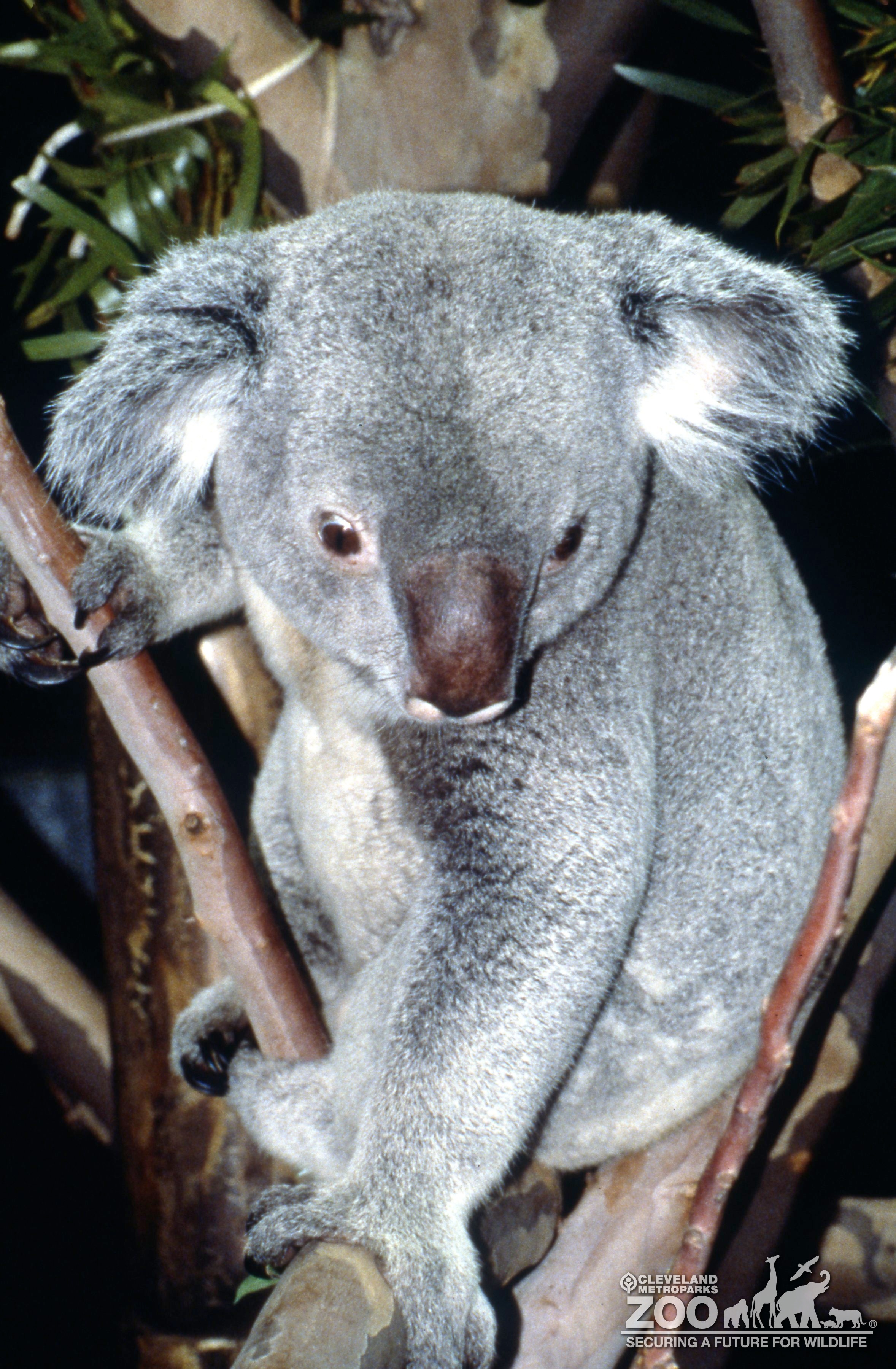 Close-up of koala sitting on exhibit branches. It is looking forward with head angled down. It using its claws and paws to hold on.