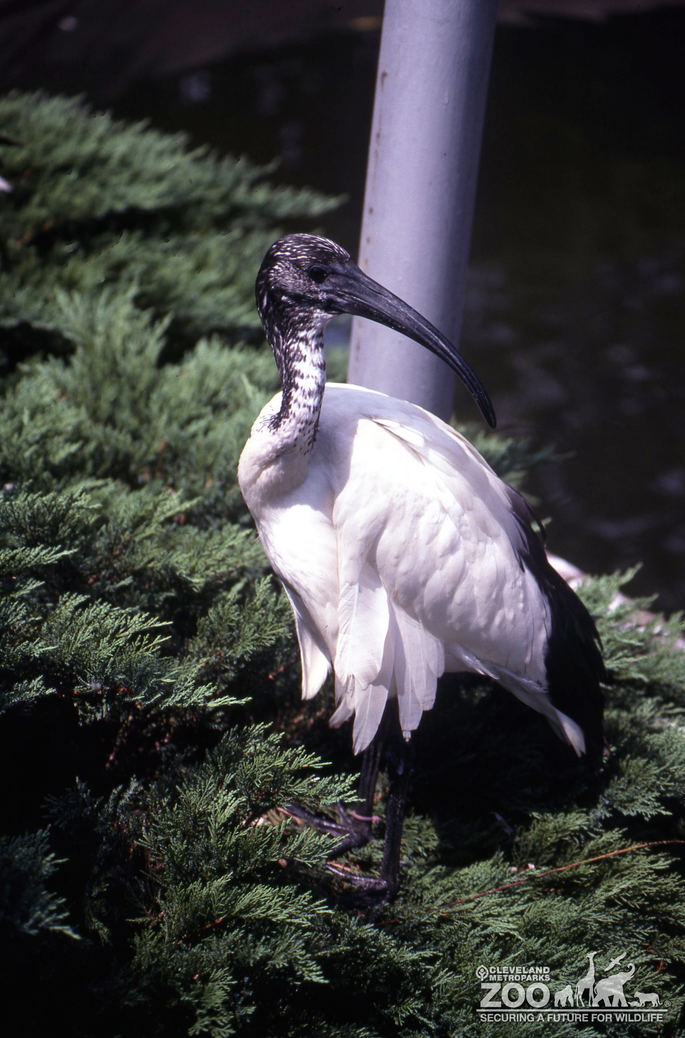 Sacred ibis standing in an evergreen bush. Head is facing to the right. Body feathers are mostly white with tail and wings tipped in black.