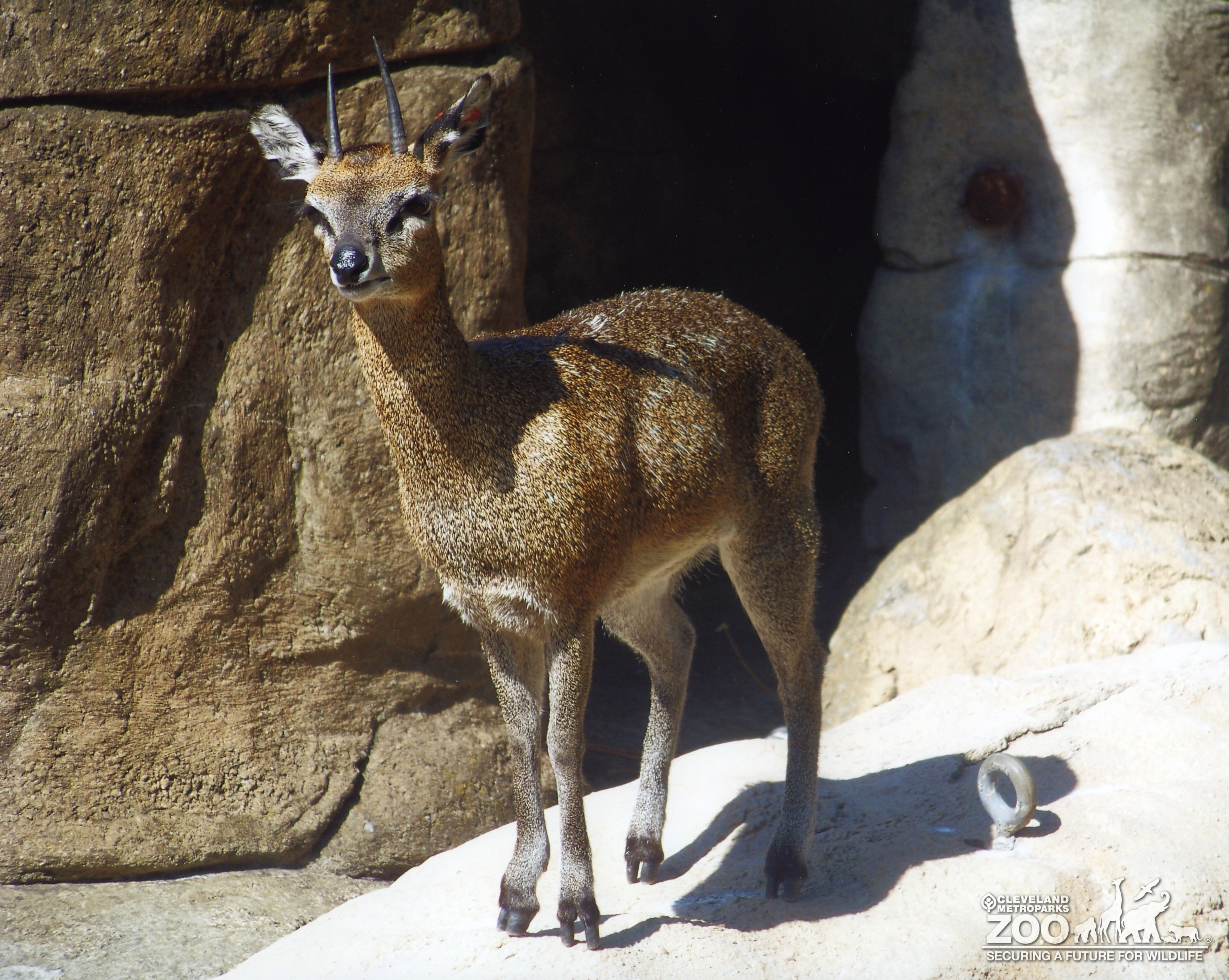 Klipspringer standing on monkey island. The bright sun is highlighting it brown fur. It has hooves that help it climb. Animal full grown is much small than a deer. Sharp antler like spikes jut for the top of it head.