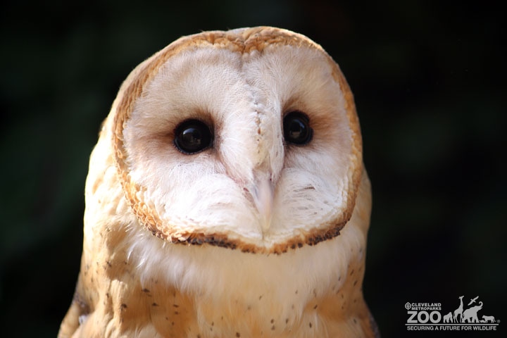 Close-up of barn owls head and neck. It has dark eyes against white feathers. Beak is white and pointed. Face is rimmed with darker feathers.