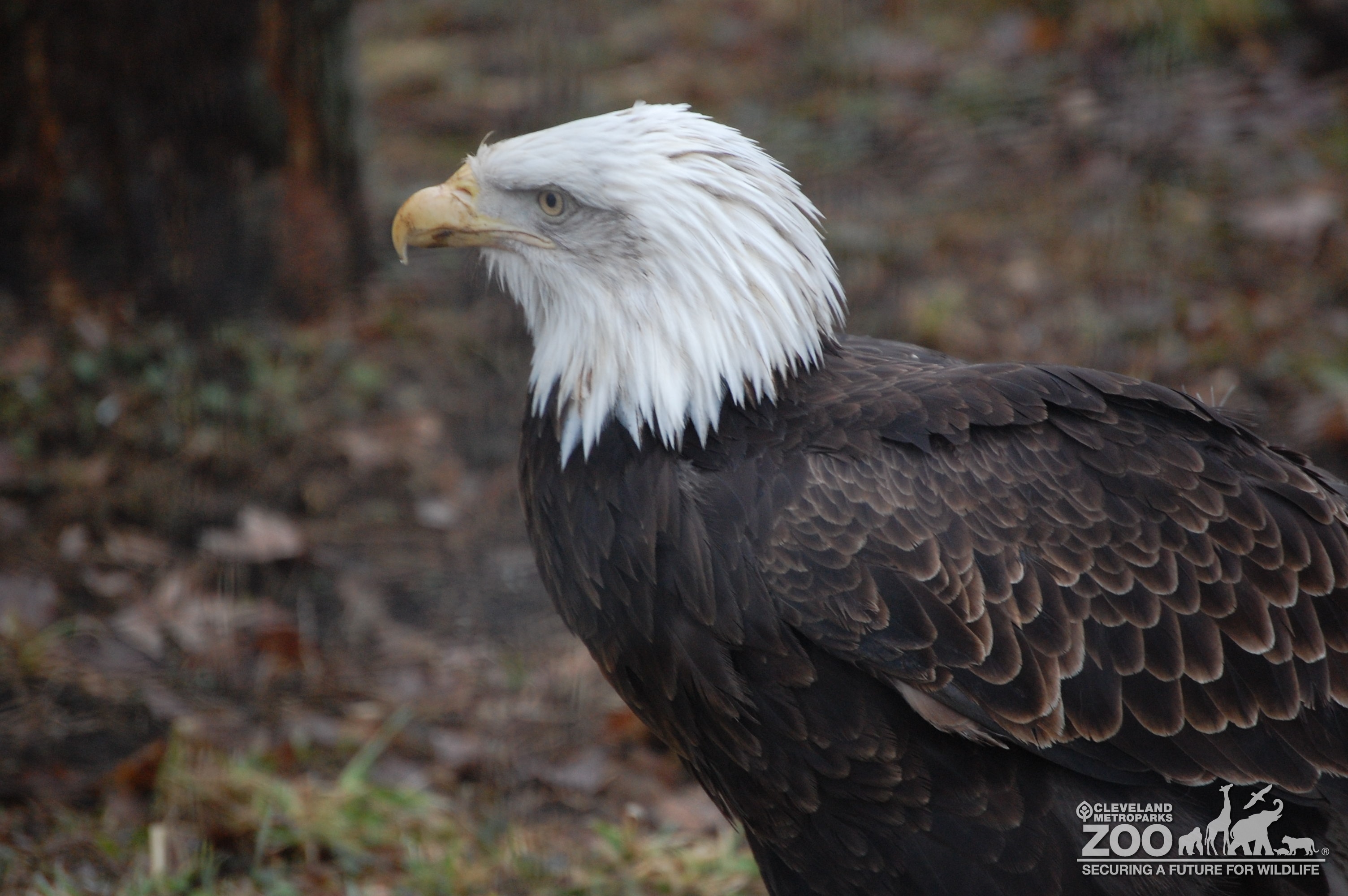 View of bald eagle in profile. Close view of eagle standing still. Feathers can be easily seen. Brown feathers on body with white feathers on the head.