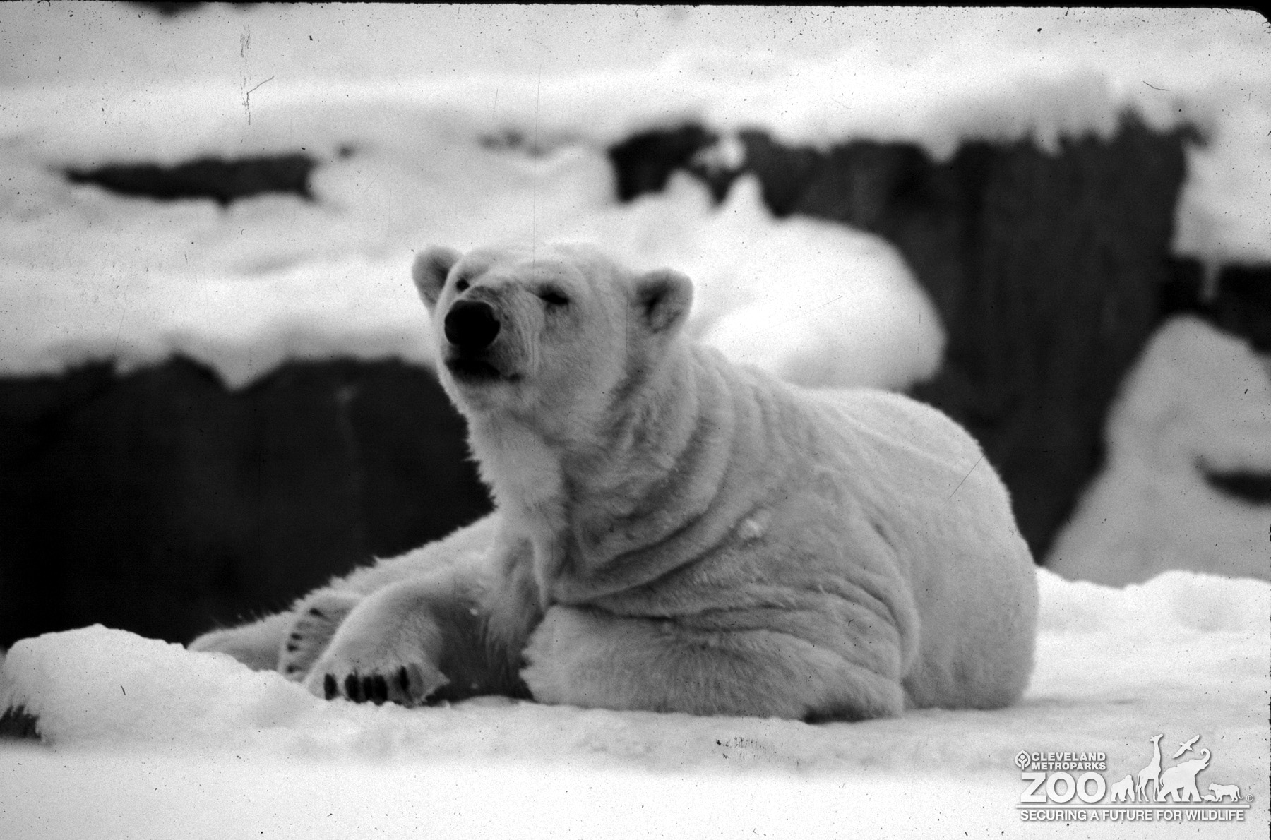 This Polar Bear is laying on its left side outside in the snow. It is looking towards the camera and is covered with short white fur, has round ears, dark eyes, and a big black nose. In the background are dark brown ledges covered in white snow drifts.