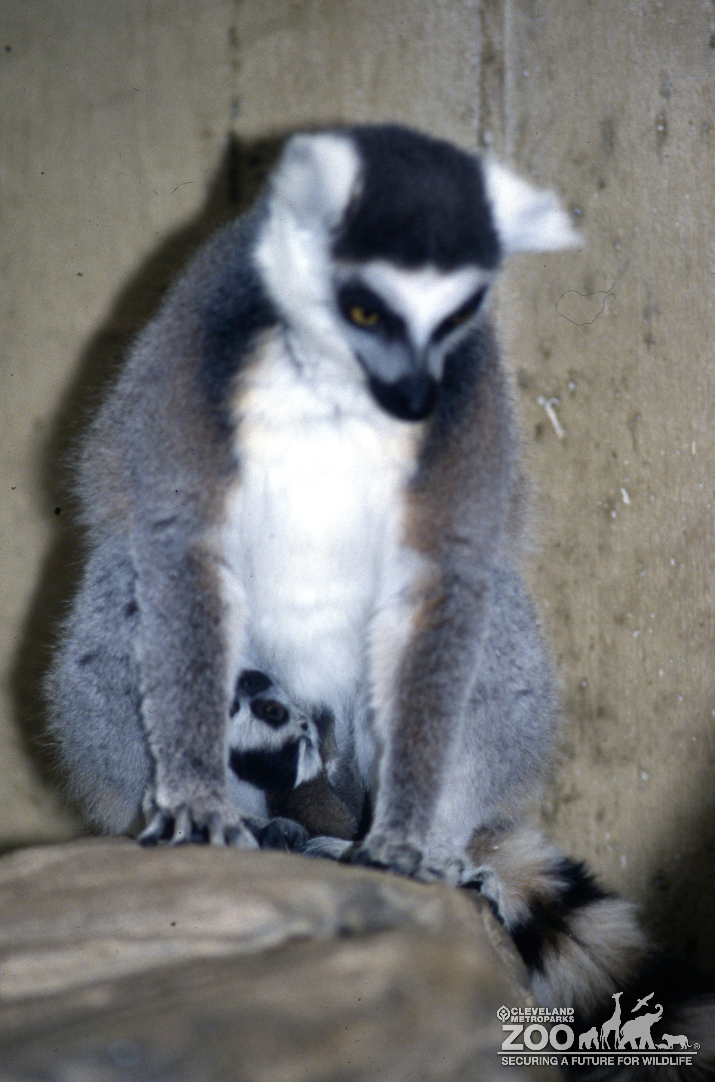 Ring-tailed lemur adult with baby lemur nestled between is legs. Primates are in their indoor exhibit at Primate, Cat & Aquatics building.