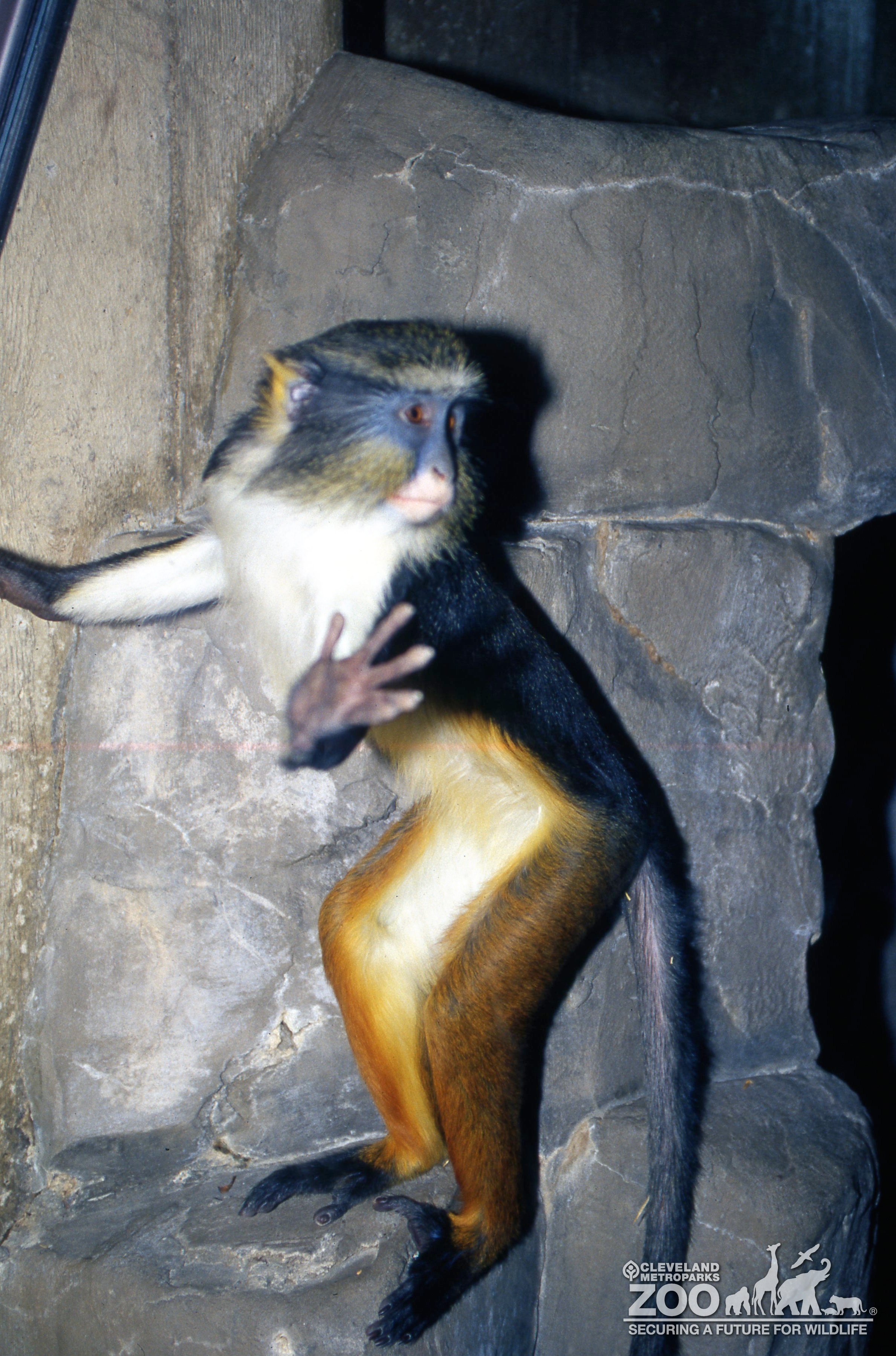 Wolf's guenon standing on a rock in indoor exhibit. This small primate has a slim body and long tail.
