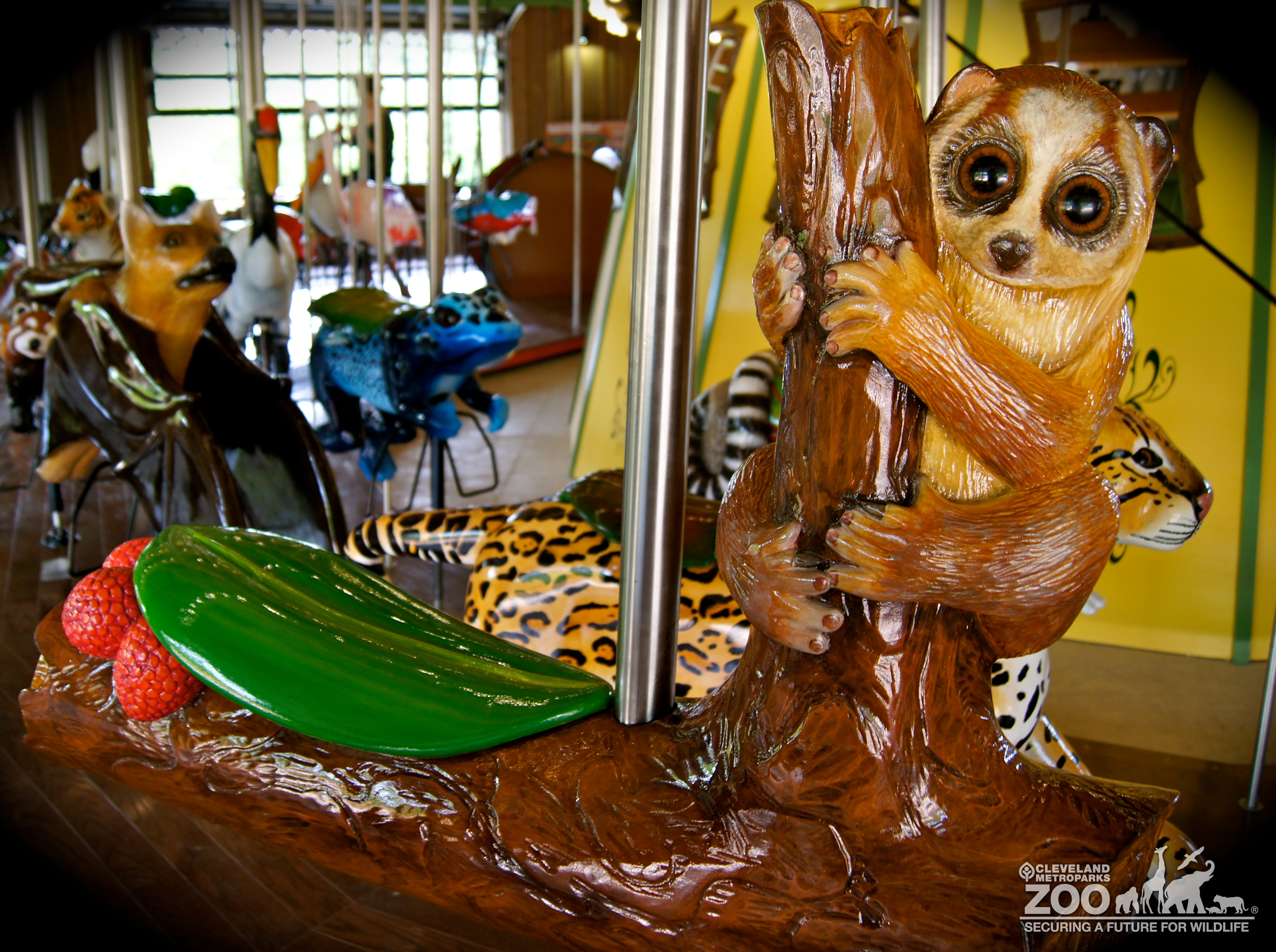 Pygmy slow loris carousel carving. This painted sculpture feature the primate with big dark round eyes and golden brown fur. View show other animals that are part of the ride.