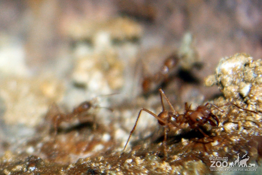 The three Leaf Cutter Ants in this photo are all dark brown in color, one Ant is very close to the camera while the other two are off in distance the moving away from it. The Ant in the bottom right hand corner is so close that it's facial features are very clear, it has black eyes and large curved dark brown mandibles. The ants are all walking a brown lumpy ground with a beige crust all over it,.
