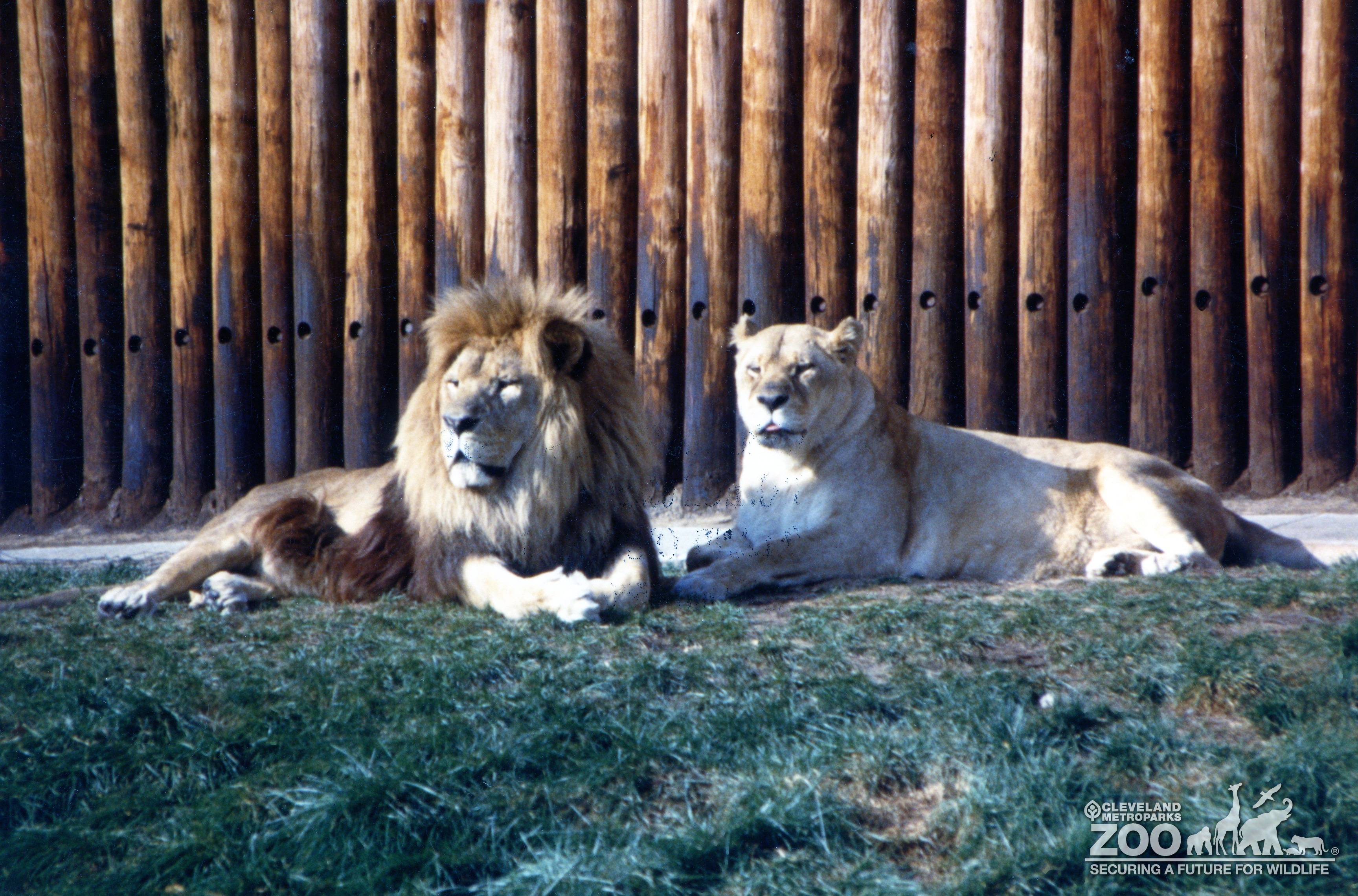 African lion and lioness laying together in grassy area of outside exhibit. Stockade wooden fence provides the background.
