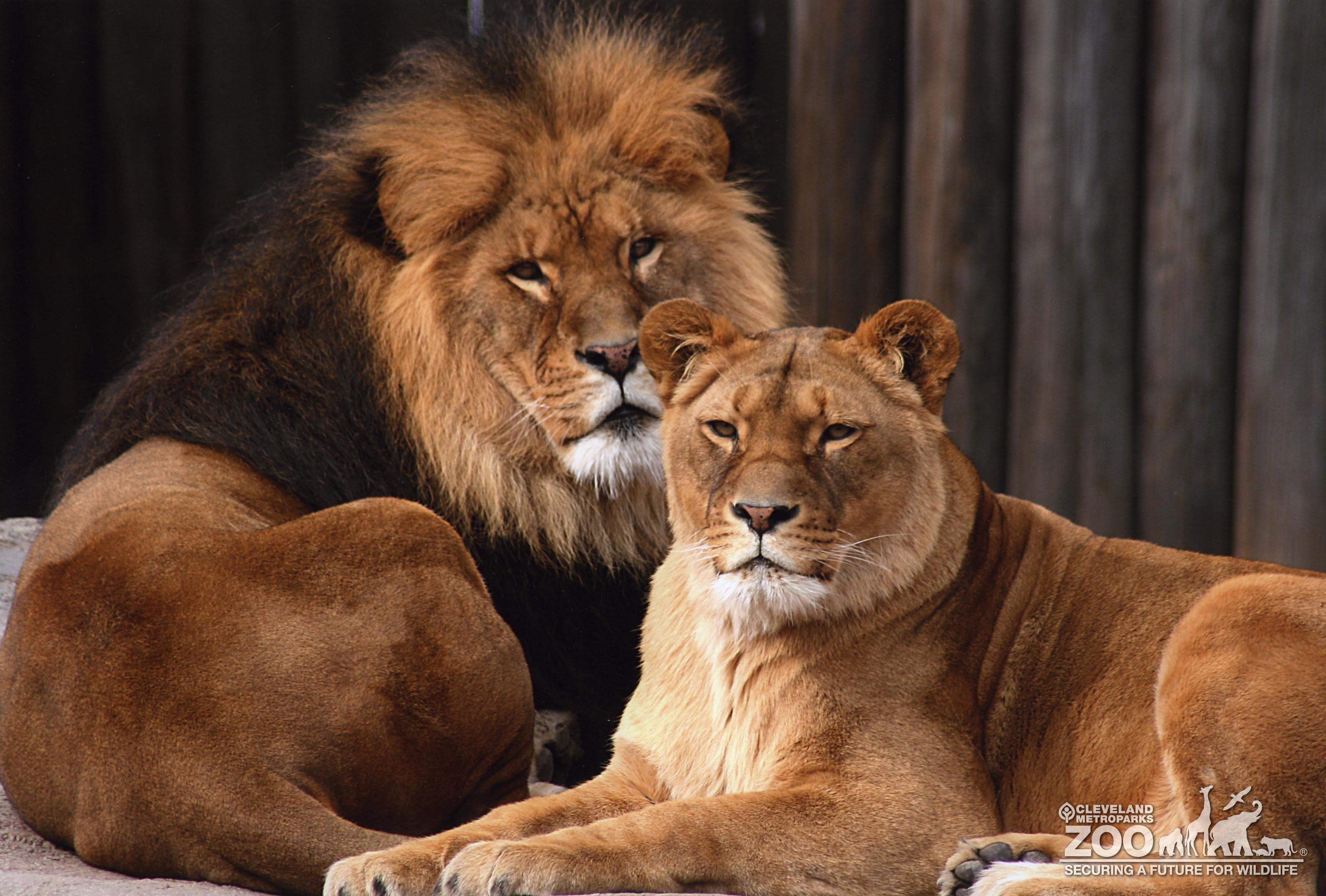 Male and female lions laying close to each other. They are outside in exhibit. Lioness is closer the camera. Wooden timbers provide a rustic backdrop.