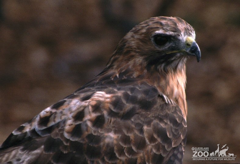 Red-tailed hawk in profile. Birds head is slightly turned to the front. Feathers are black and russet brown fringed in white. Large dark eyes and beak.