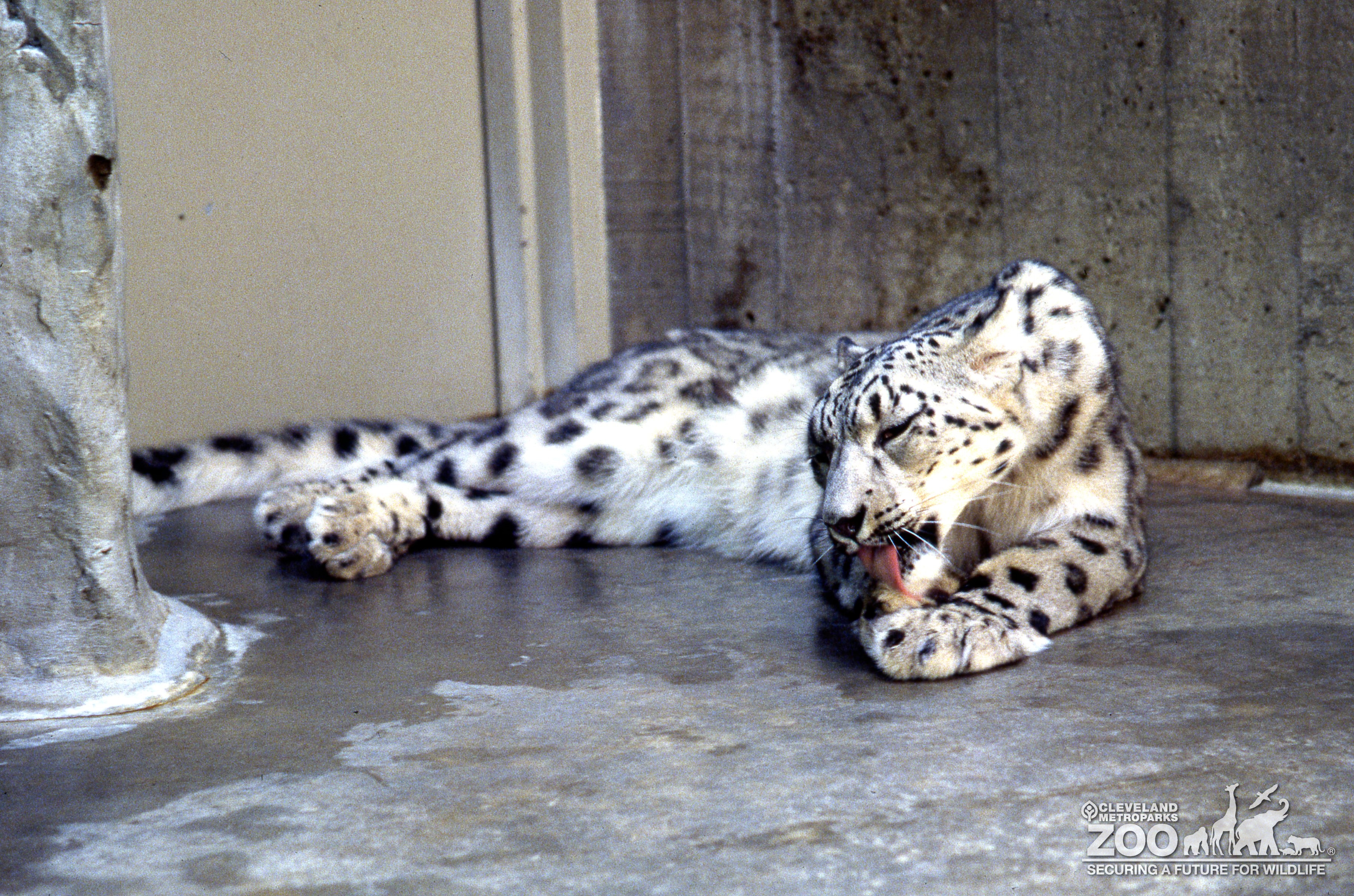 Snow leopard cleaning its paw. Indoor exhibit and Primate, Cat & Aquatic Building. Concrete floors and walls.